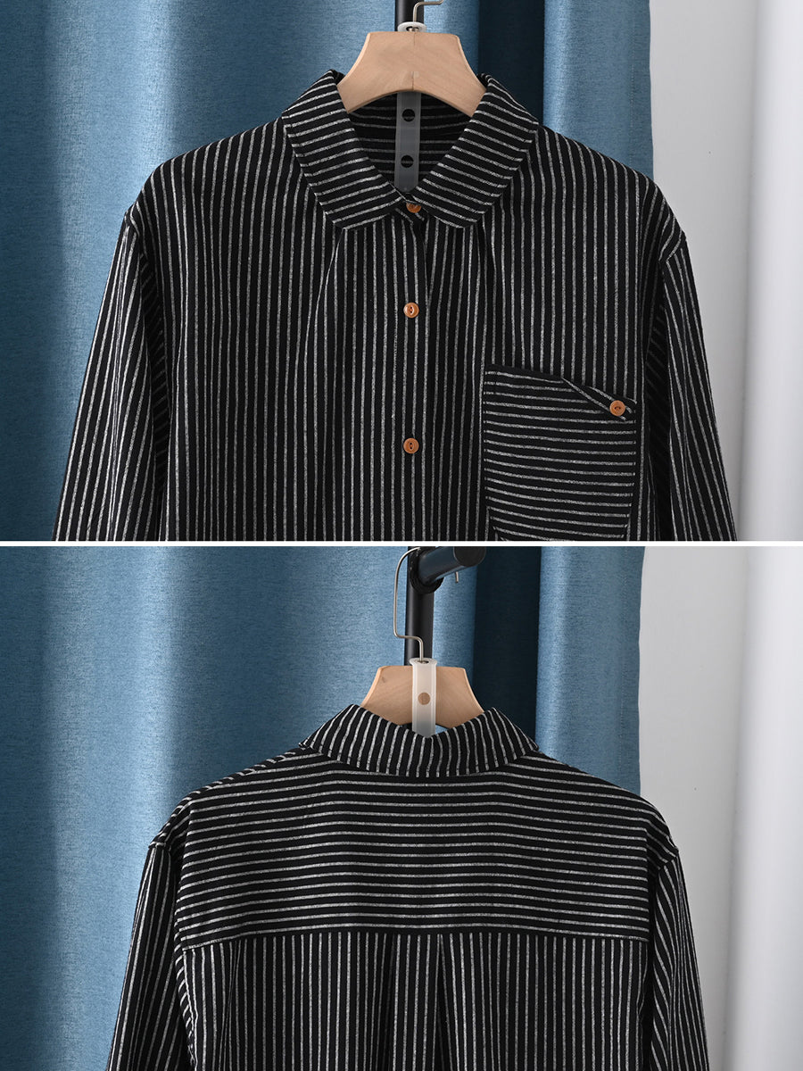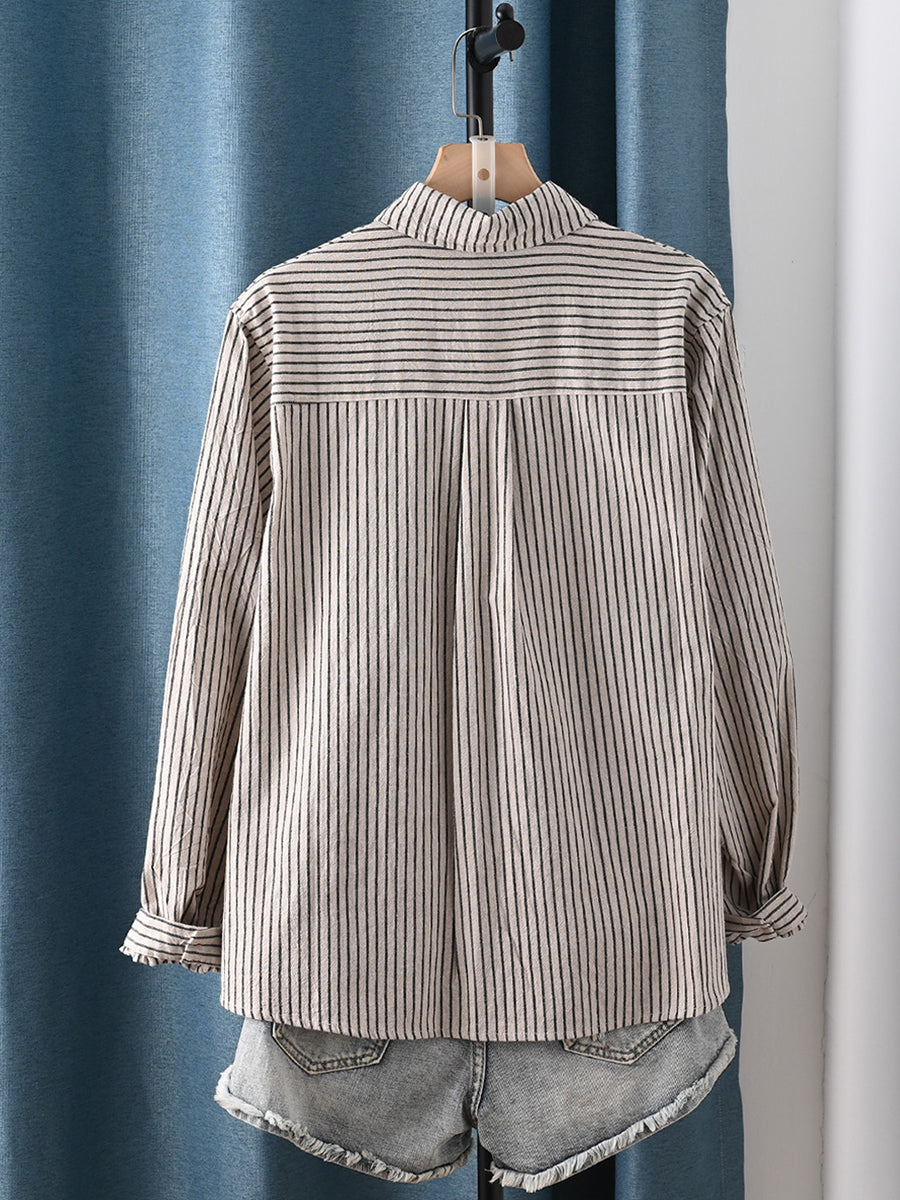 Camisa de mujer de primavera con cuello vuelto y rayas artísticas 100 % algodón