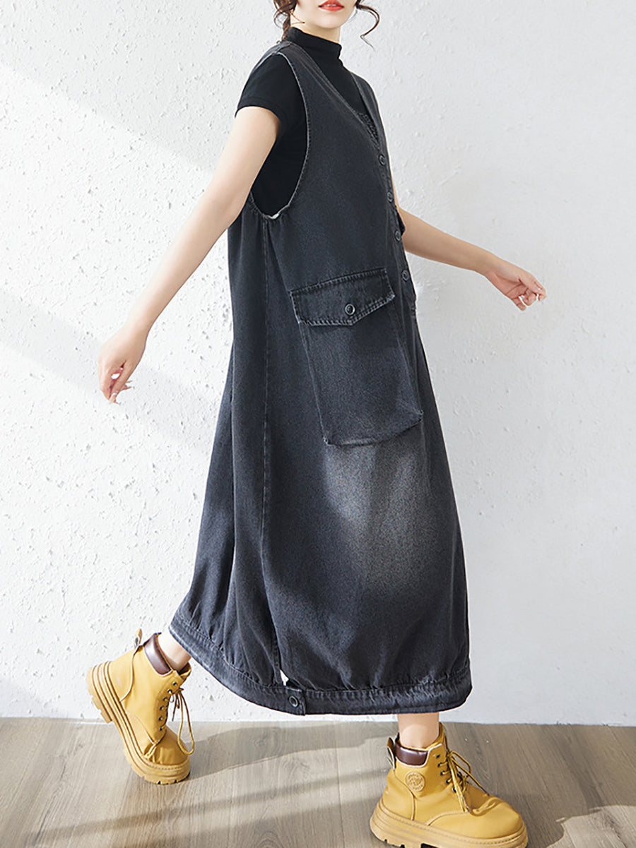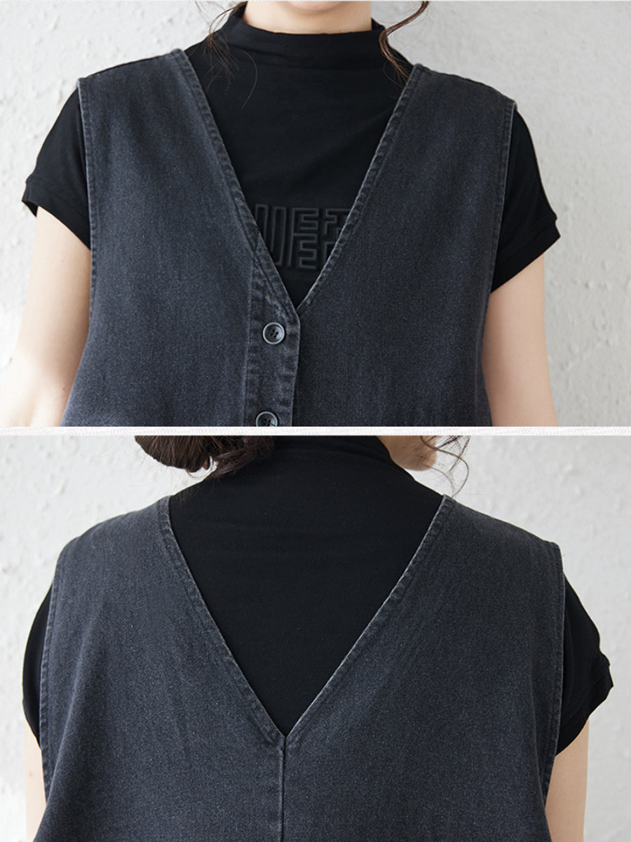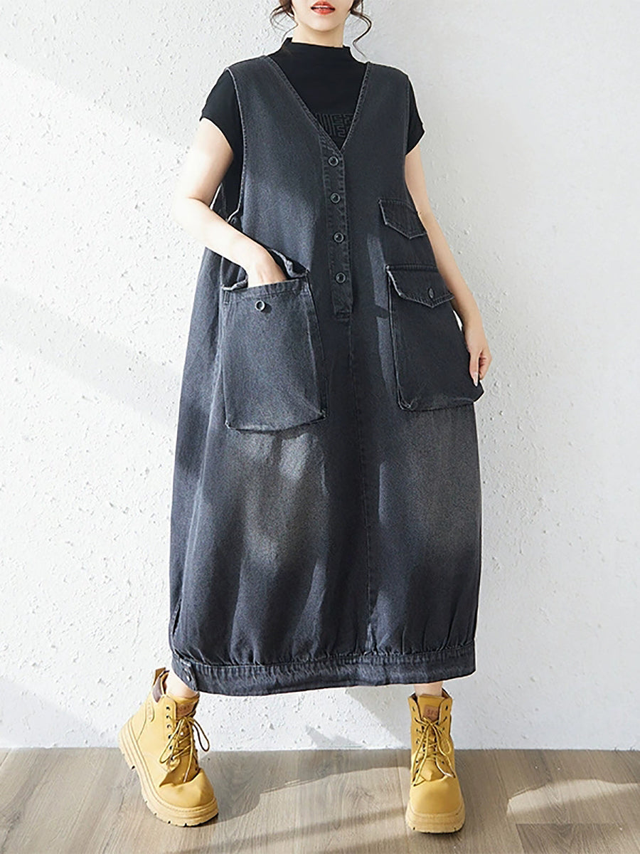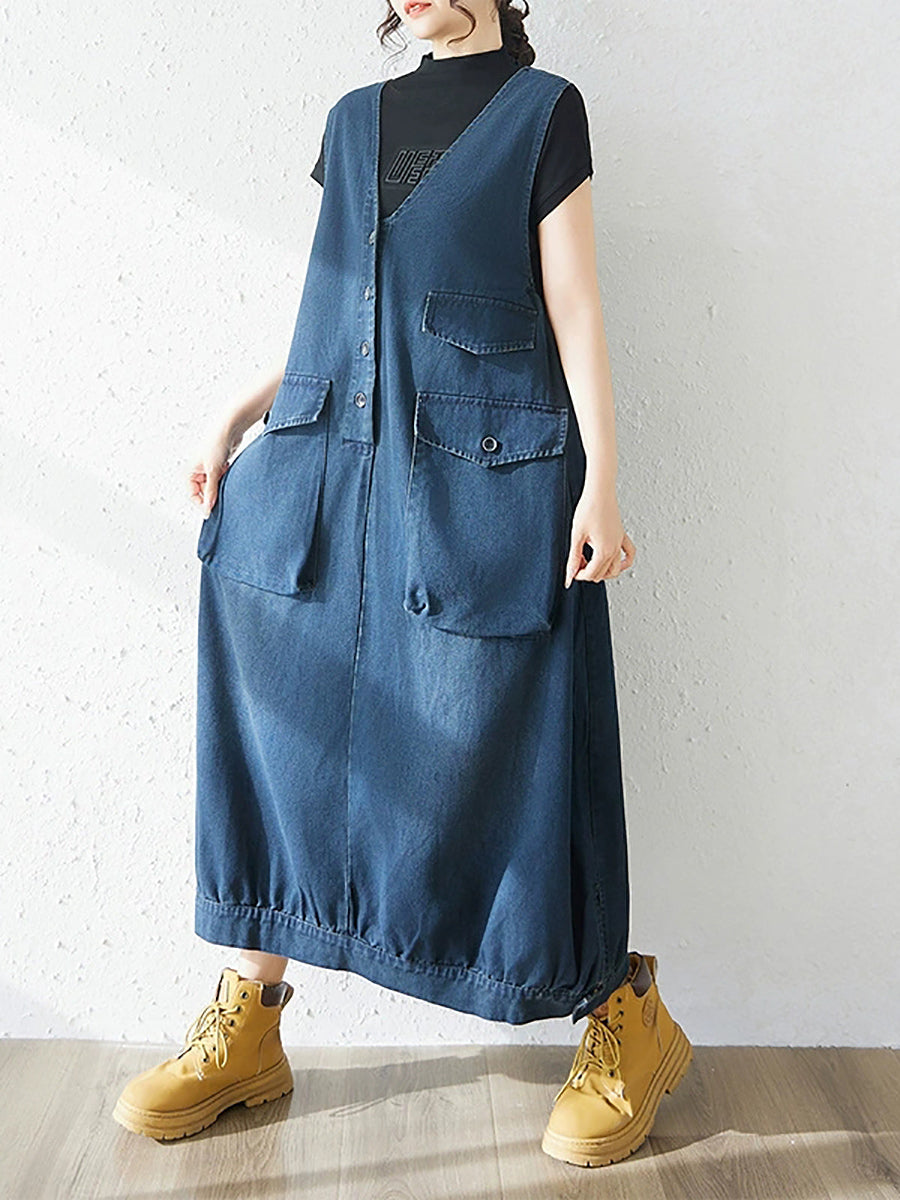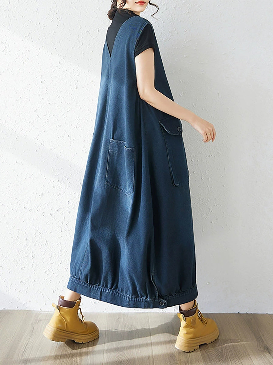Vestido informal de mezclilla con cuello en V y color puro para mujer, primavera