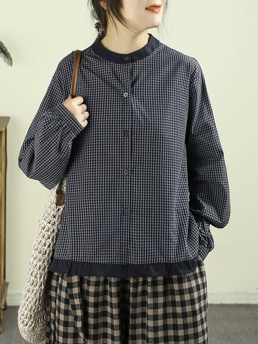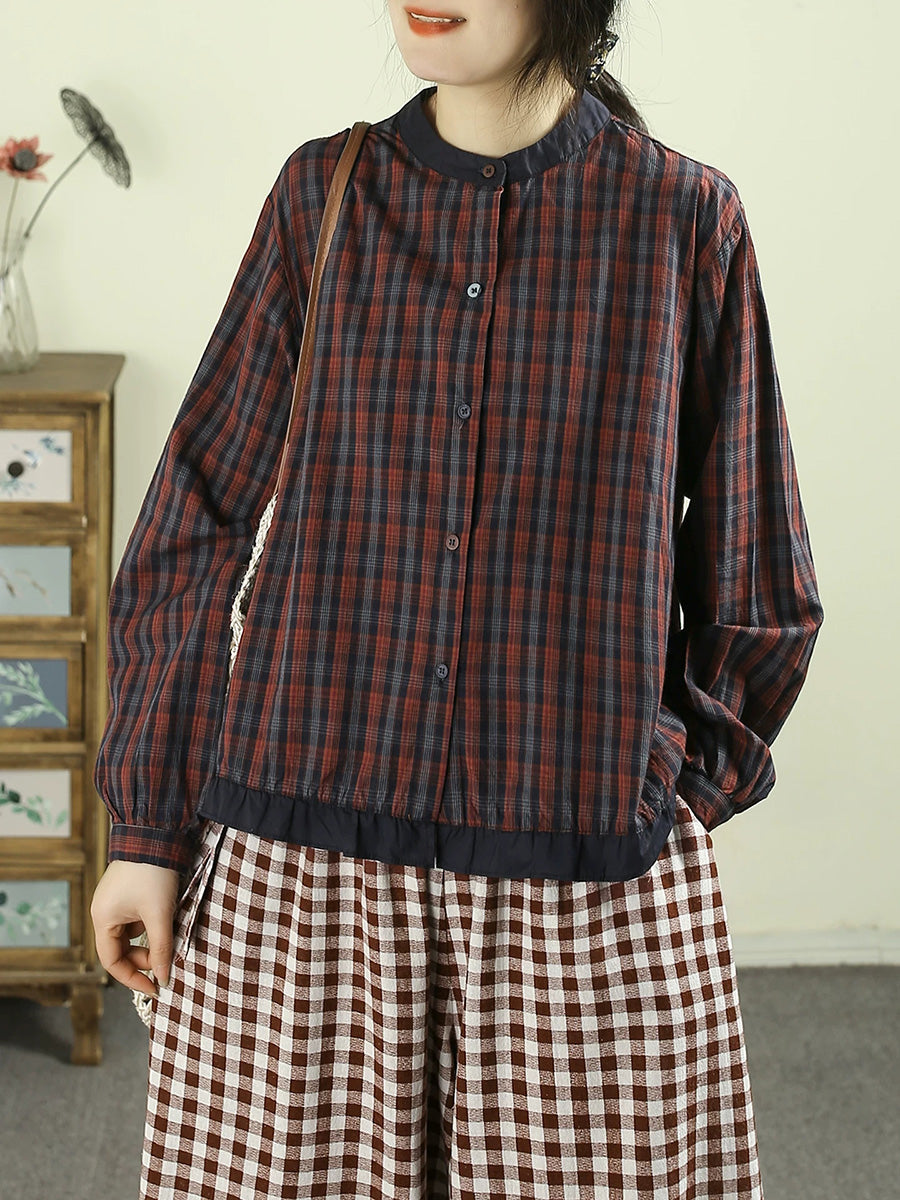 Camisa de cuello alto 100 % algodón a cuadros retro de primavera para mujer
