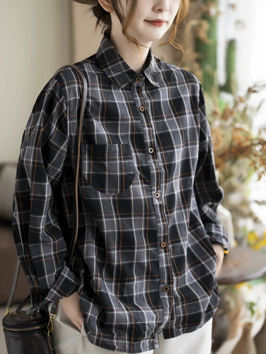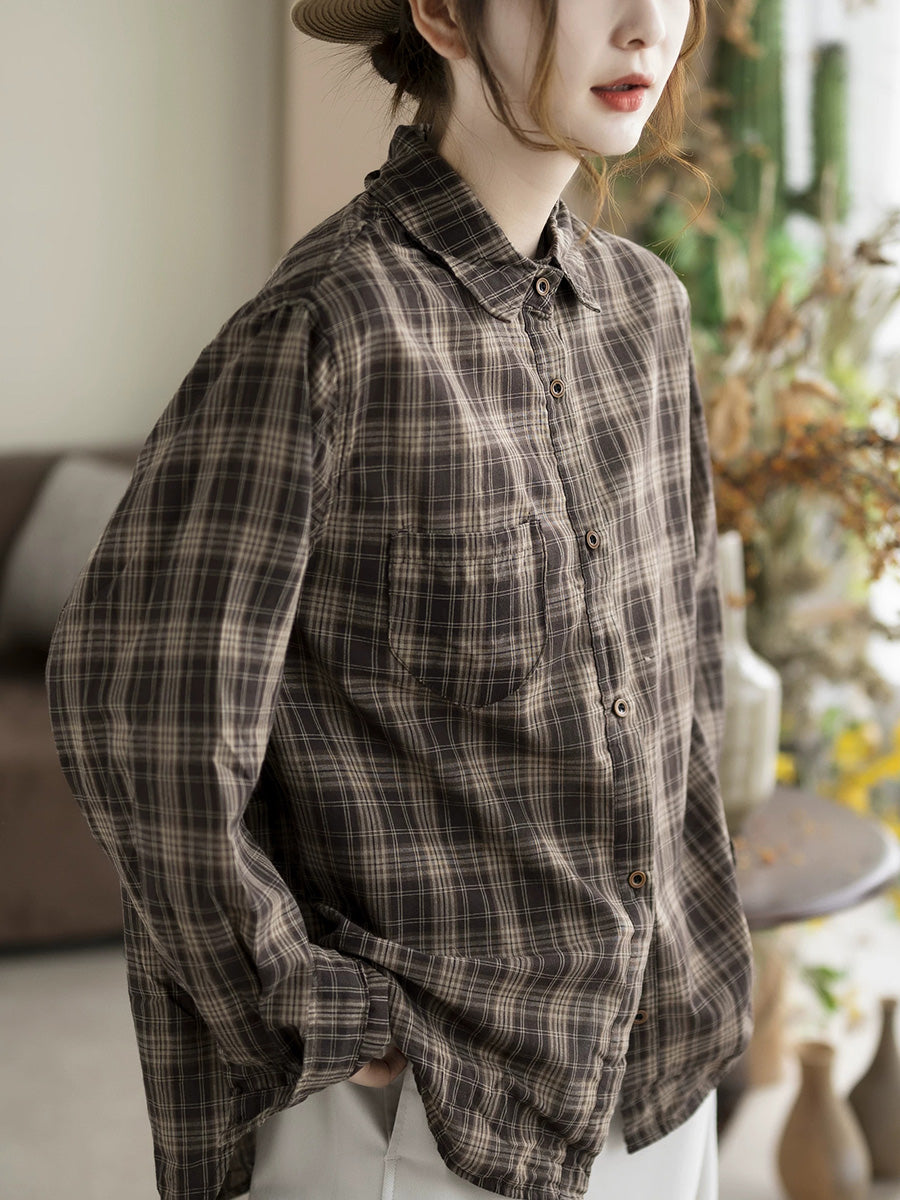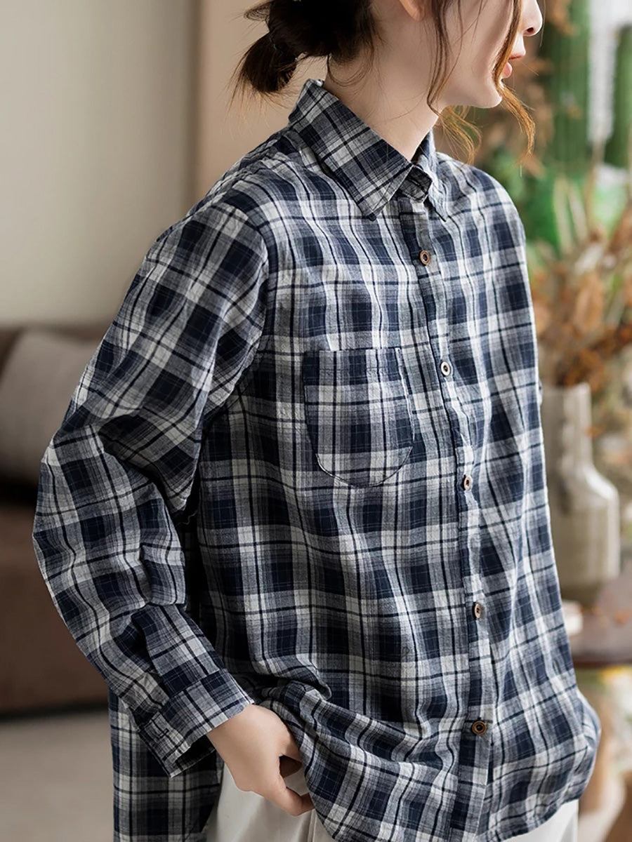 Camisa de algodón a cuadros retro con cuello vuelto para mujer de primavera