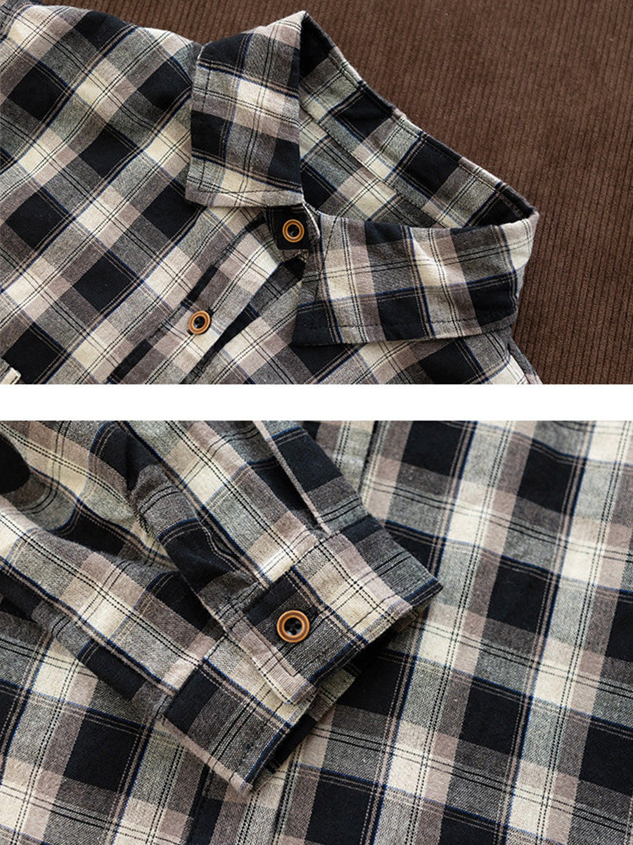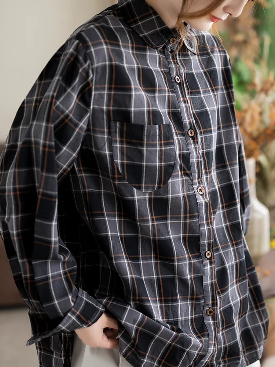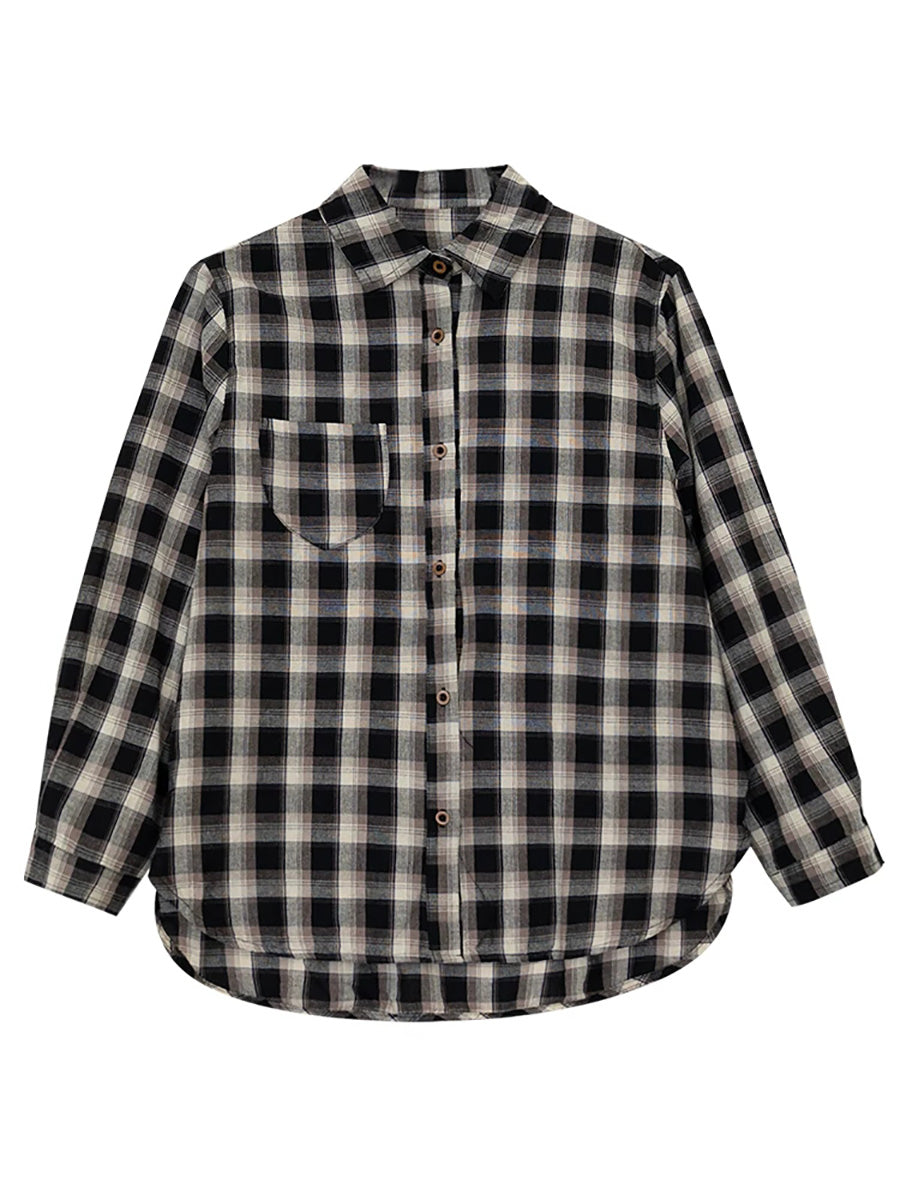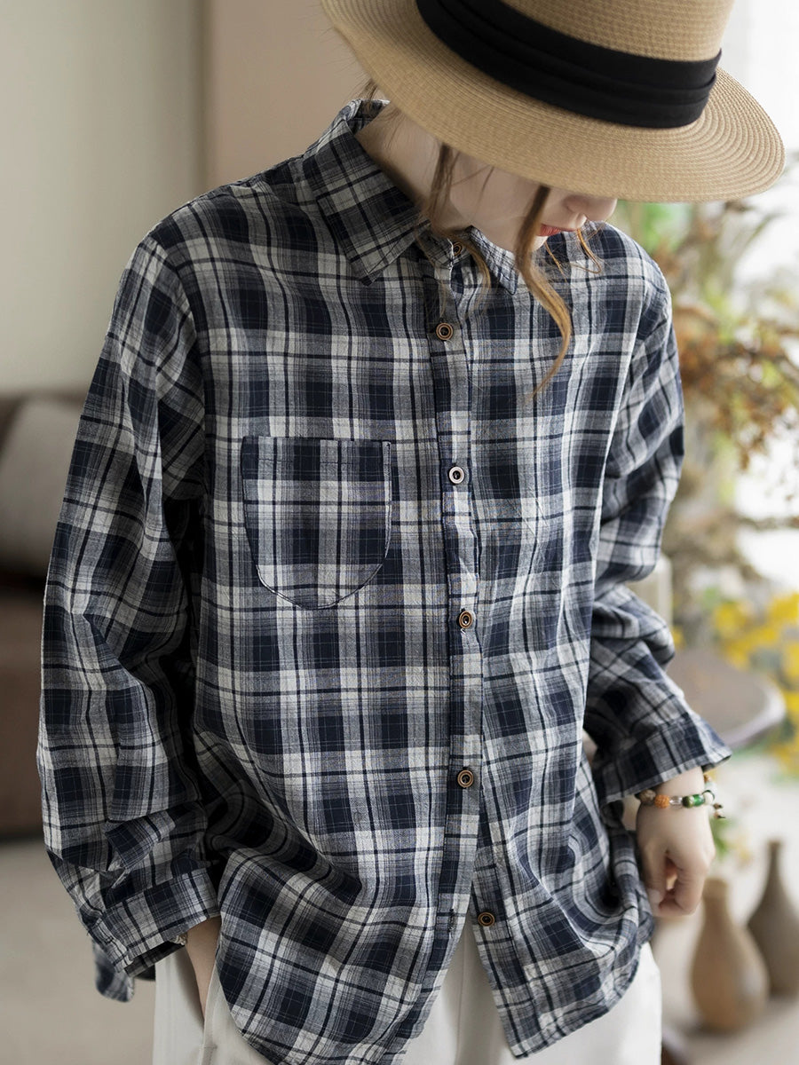 Camisa de algodón a cuadros retro con cuello vuelto para mujer de primavera