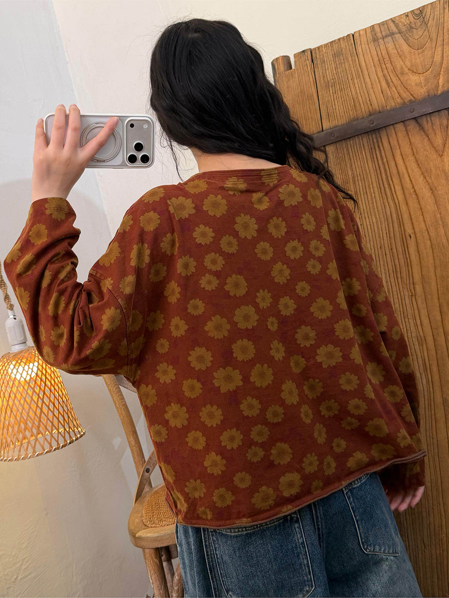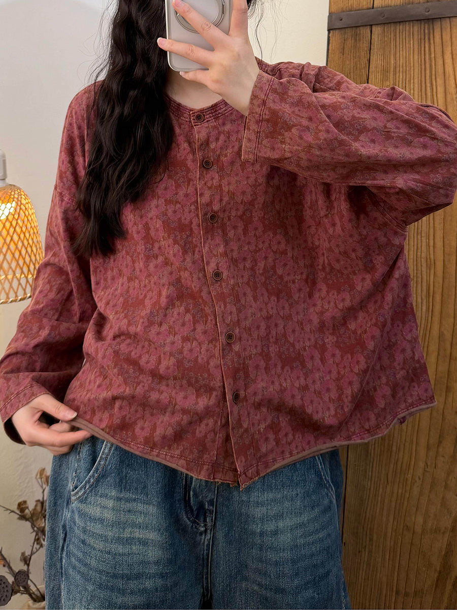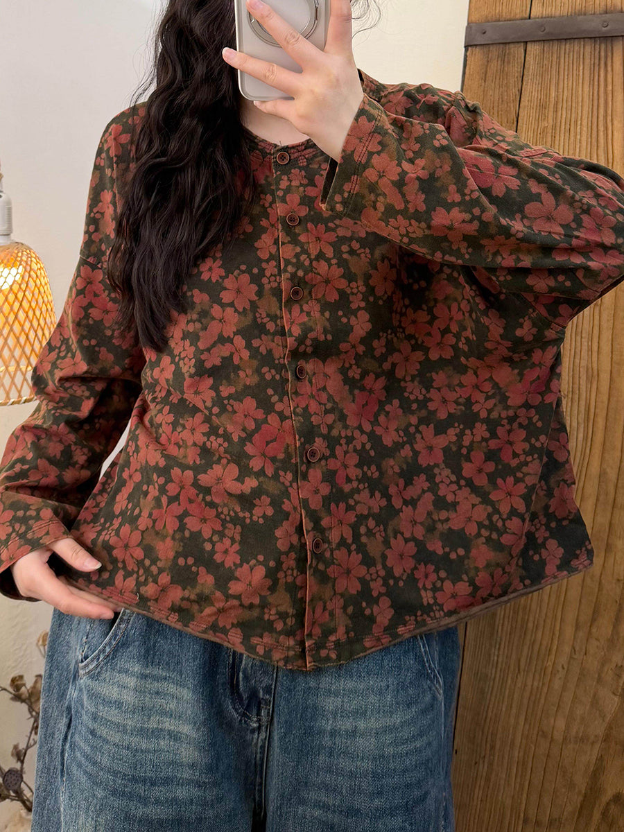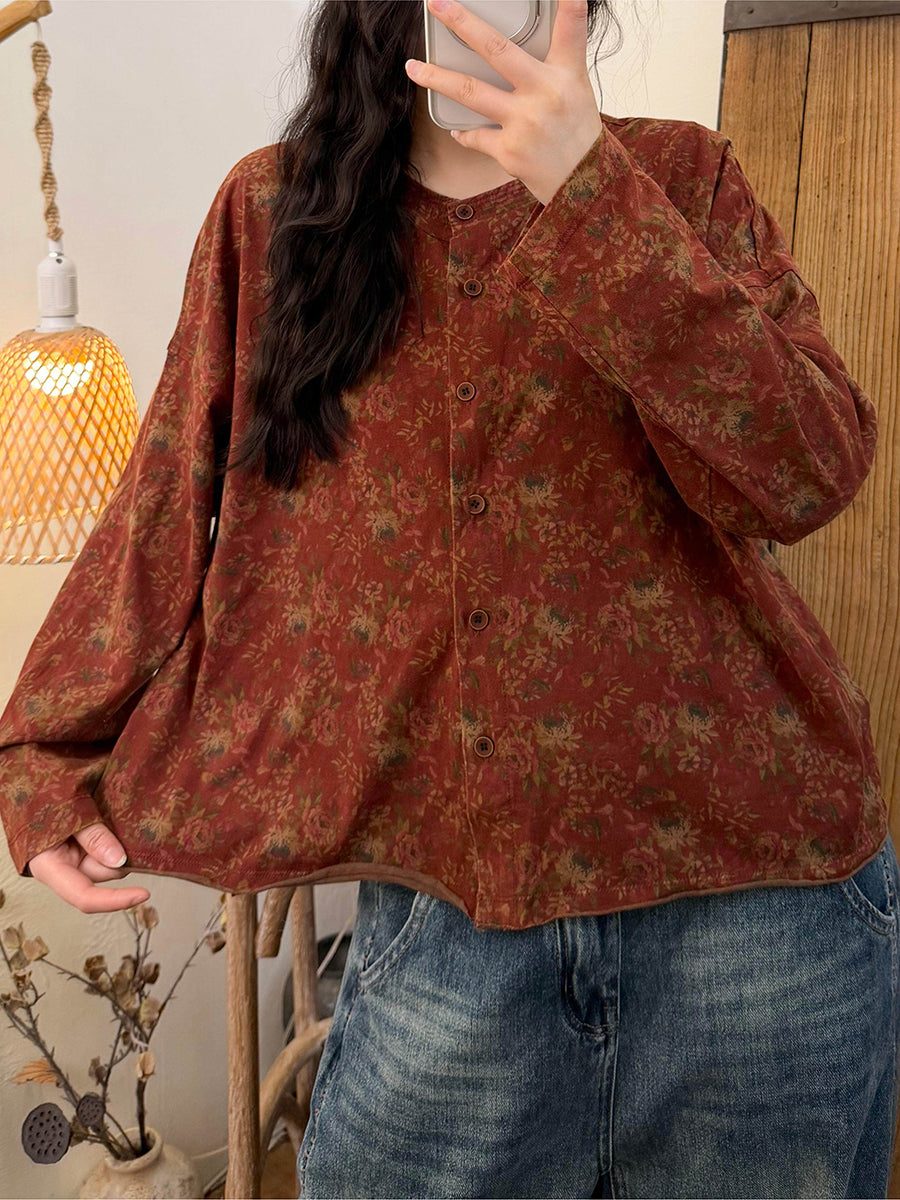 Camisa vintage de primavera con cuello redondo y flores para mujer