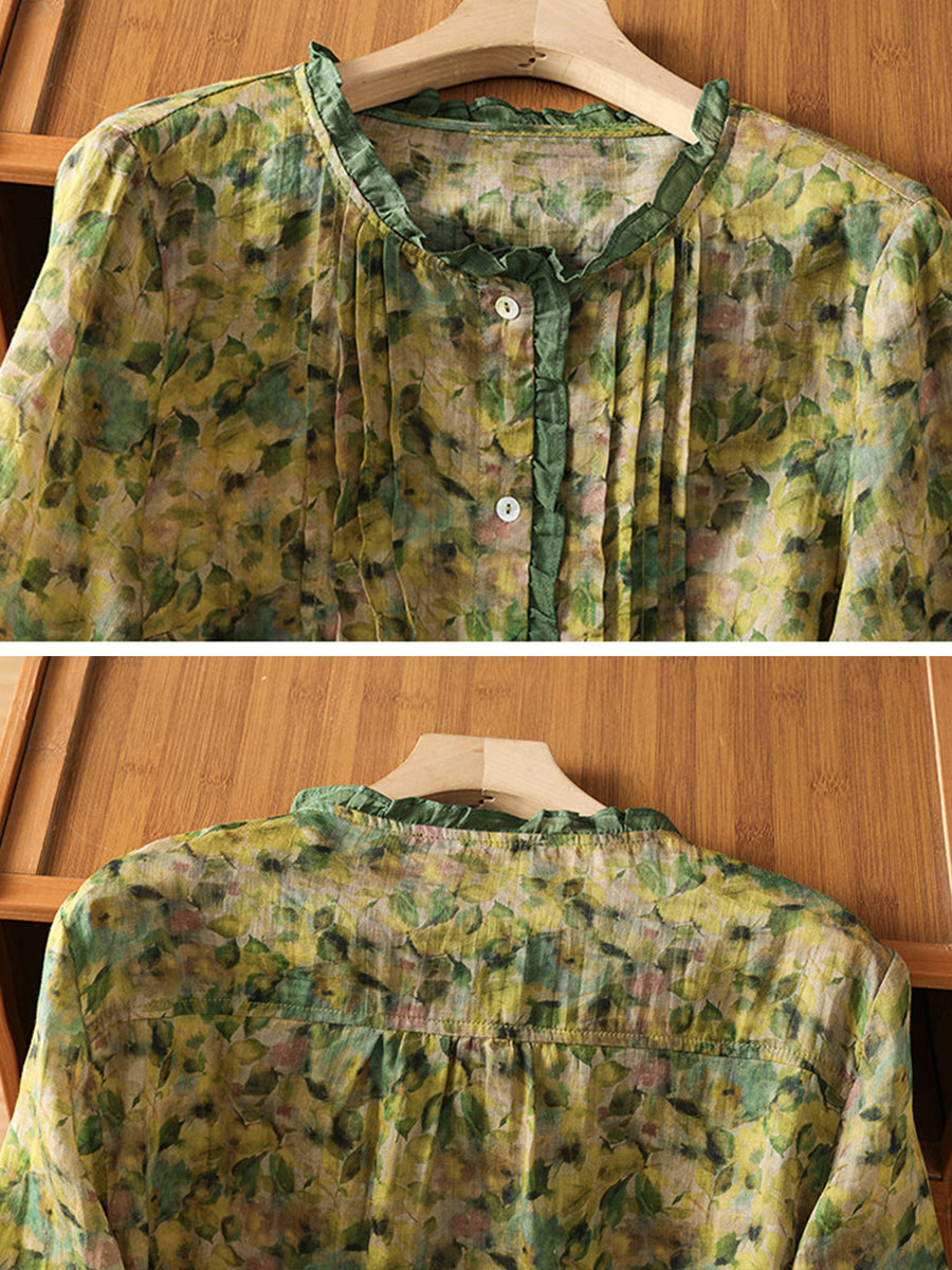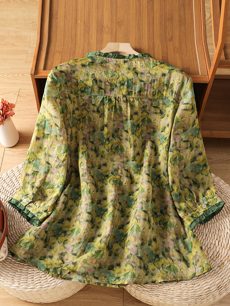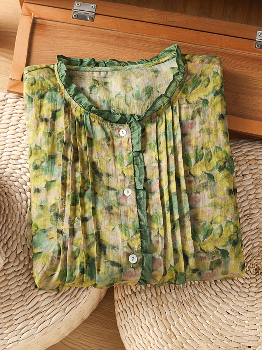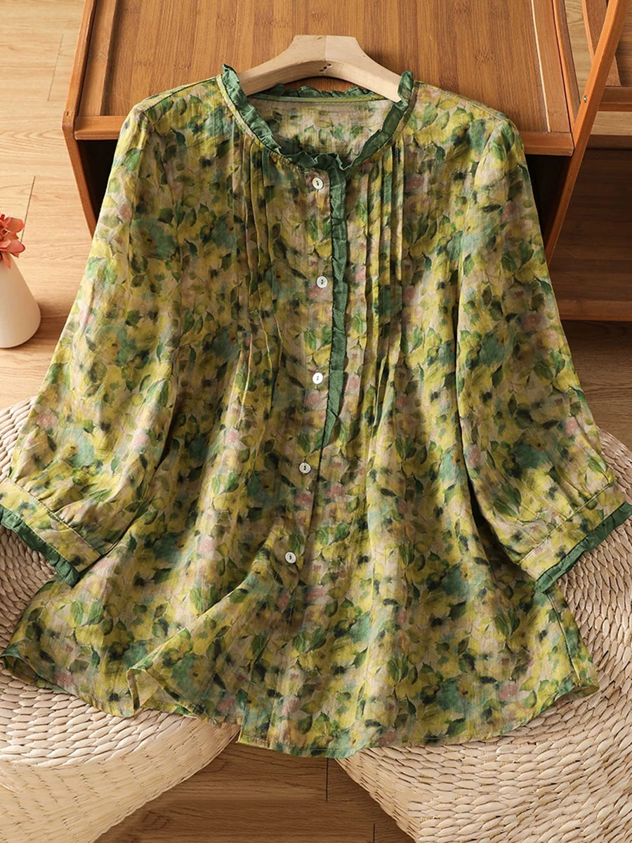 Blusa de verano para mujer con cuello redondo y estampado floral artístico.