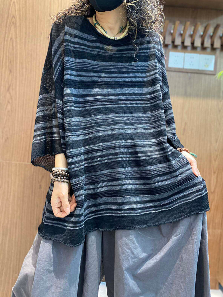 Blusa de punto de cuello redondo con rayas estilo artístico para mujer, ideal para el verano.