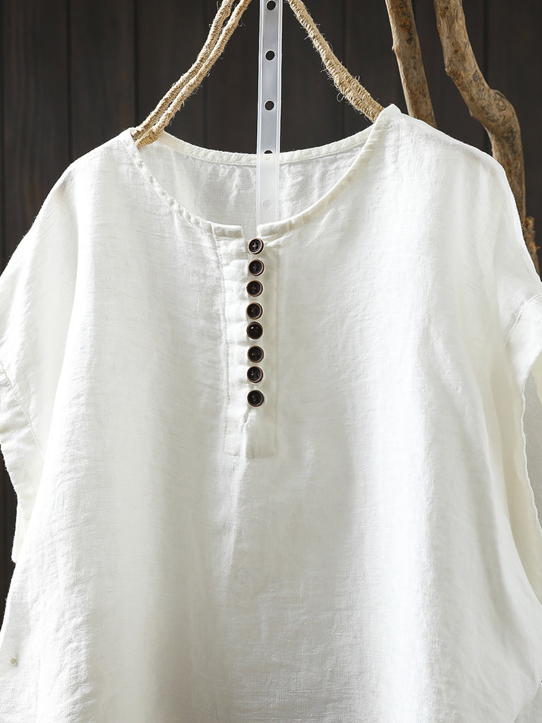 Camisa informal de verano para mujer, de lino 100 % con cuello redondo y color puro