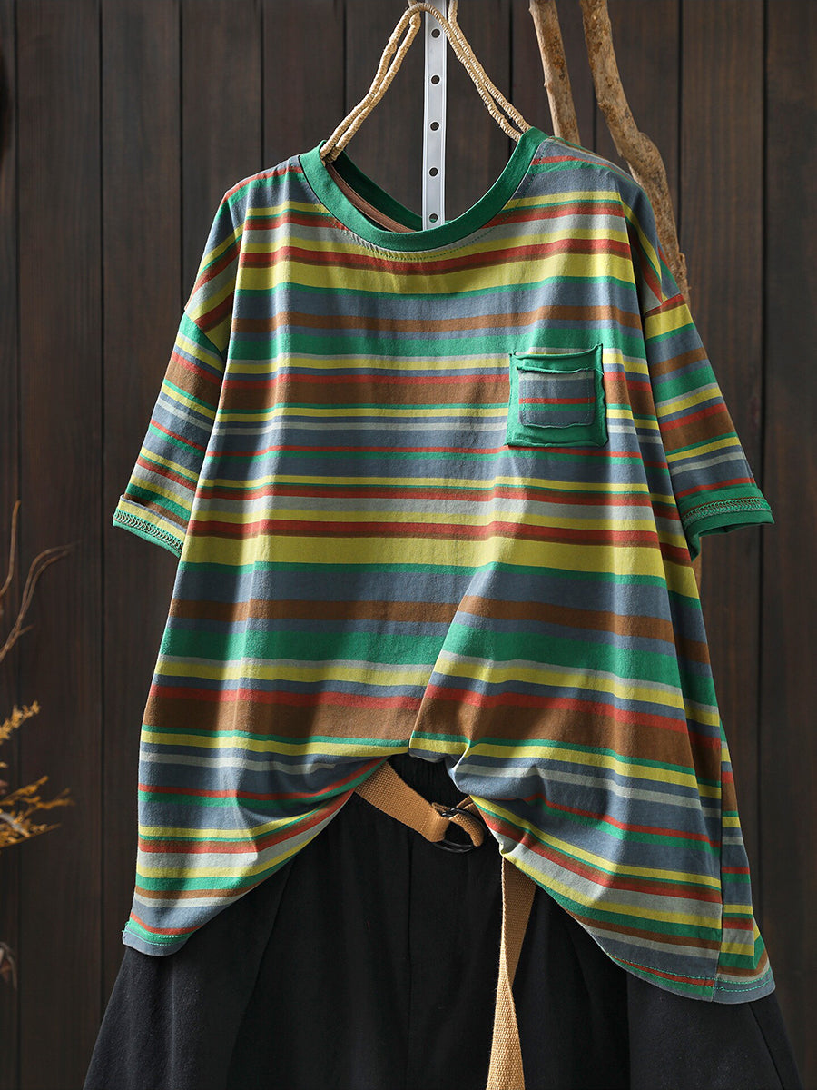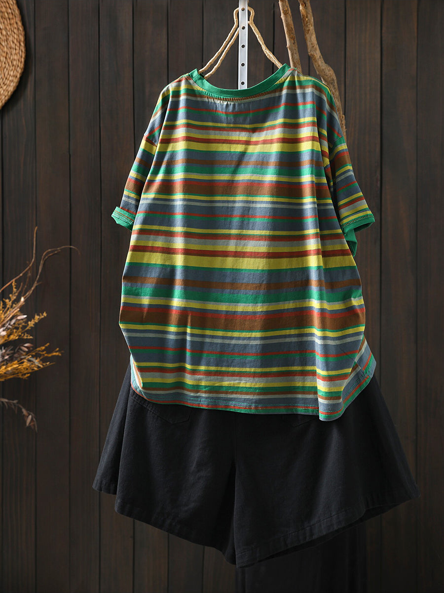 Blusa de mujer informal de verano a rayas de algodón con cuello redondo.