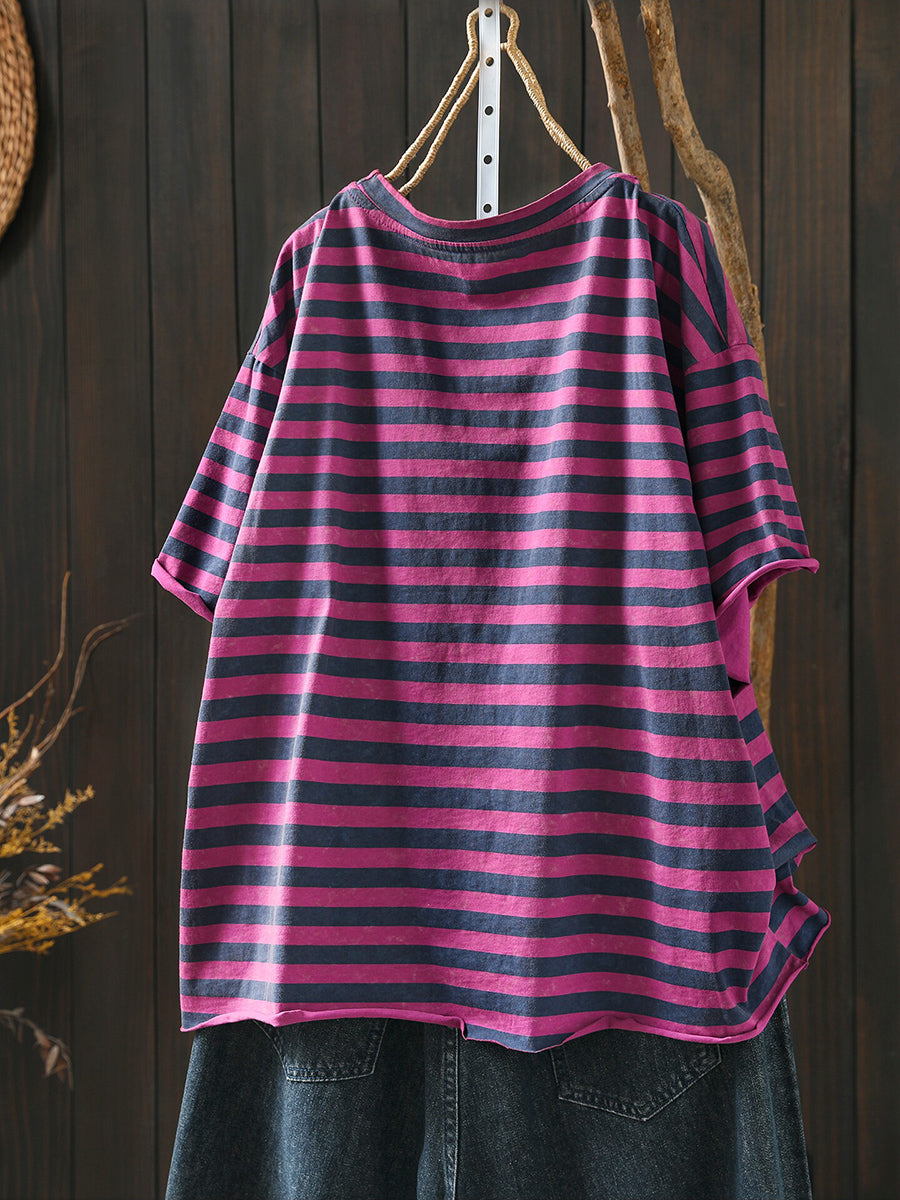 Camisa informal de verano a rayas con cuello redondo para mujer
