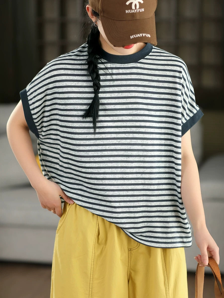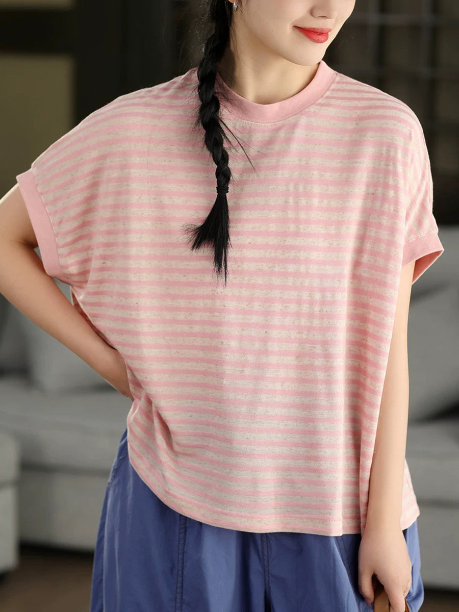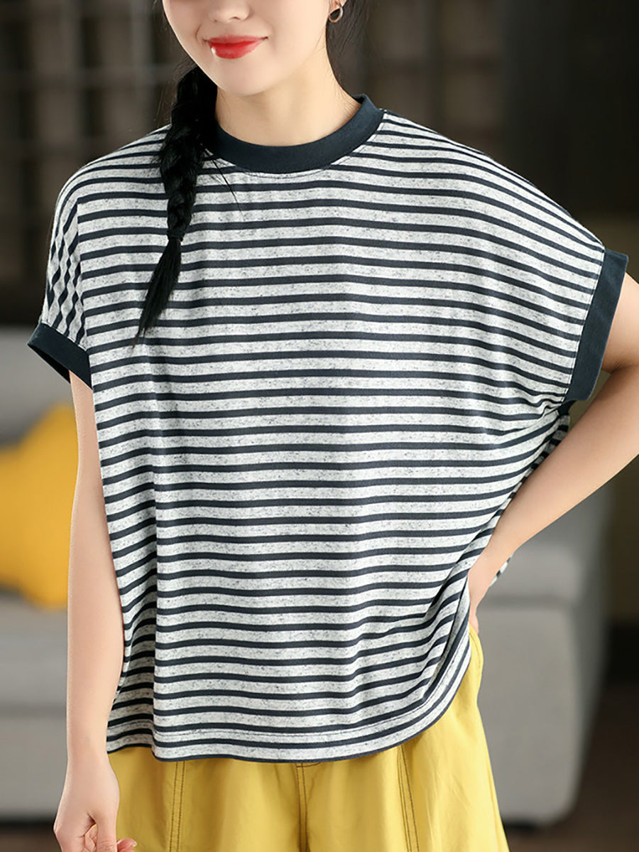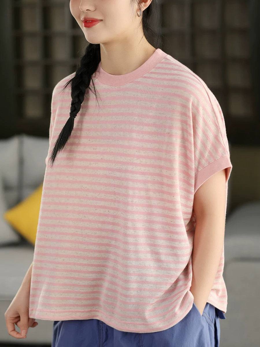 Camisa de mujer informal de verano con cuello redondo y rayas