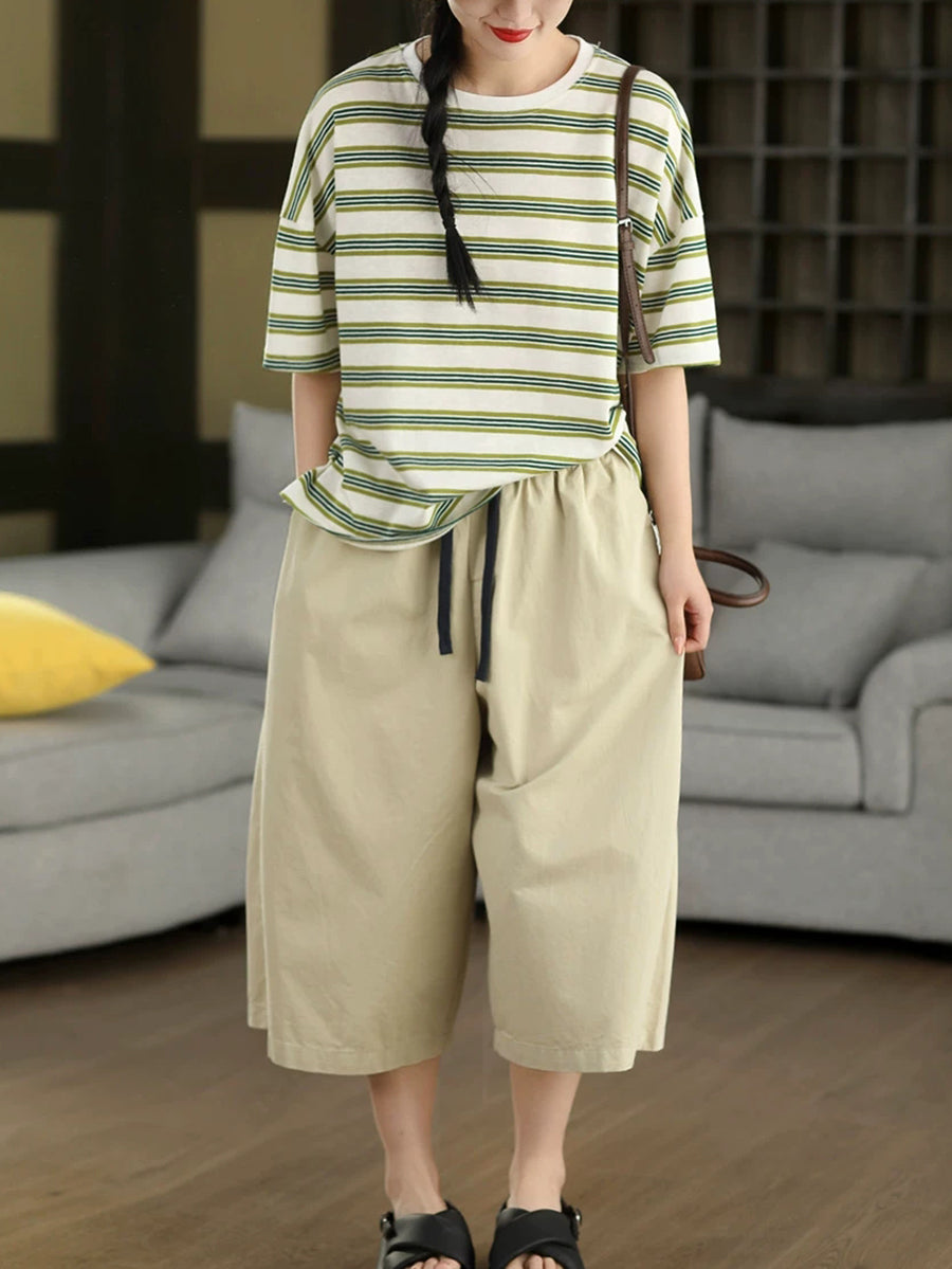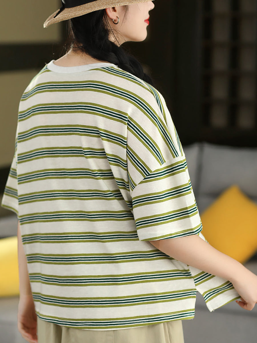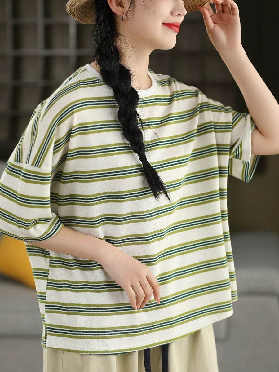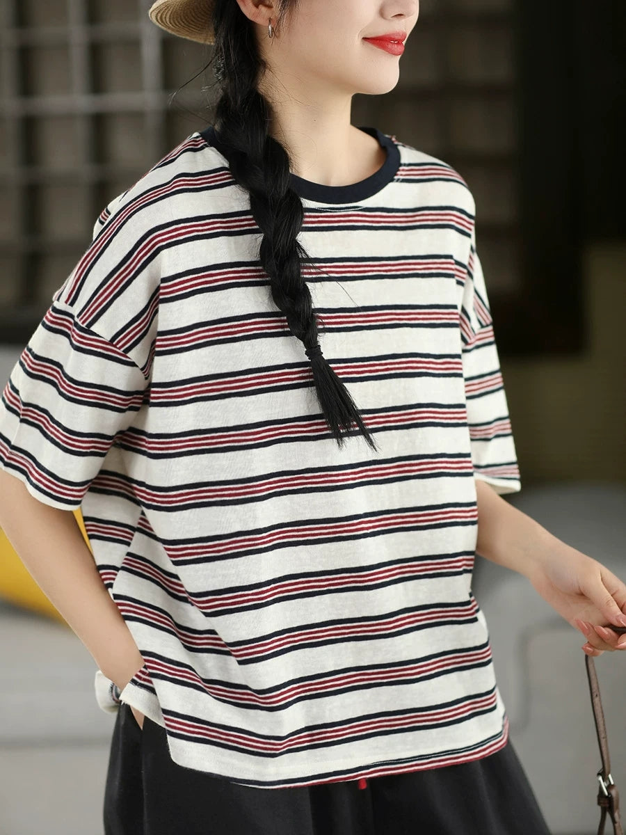 Camiseta de mujer informal de verano con cuello redondo y rayas