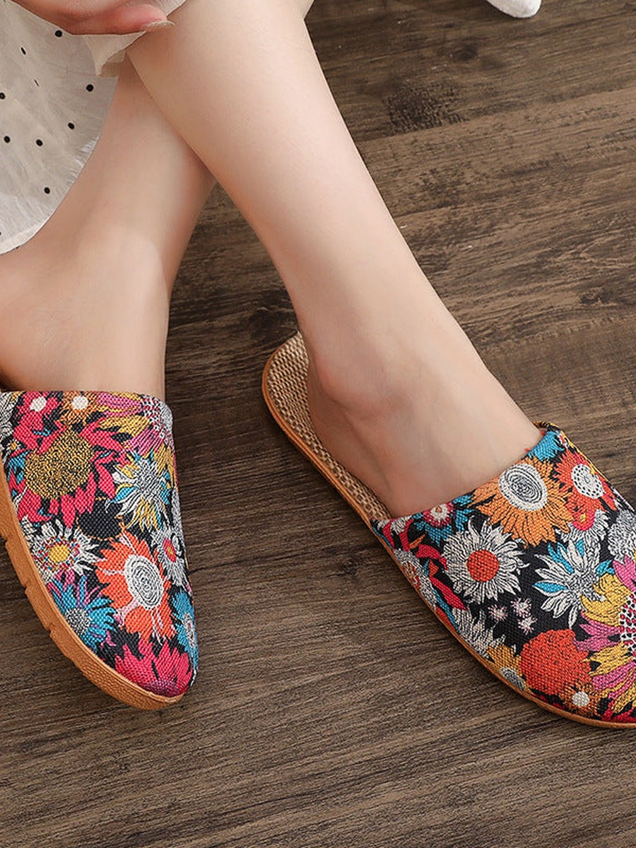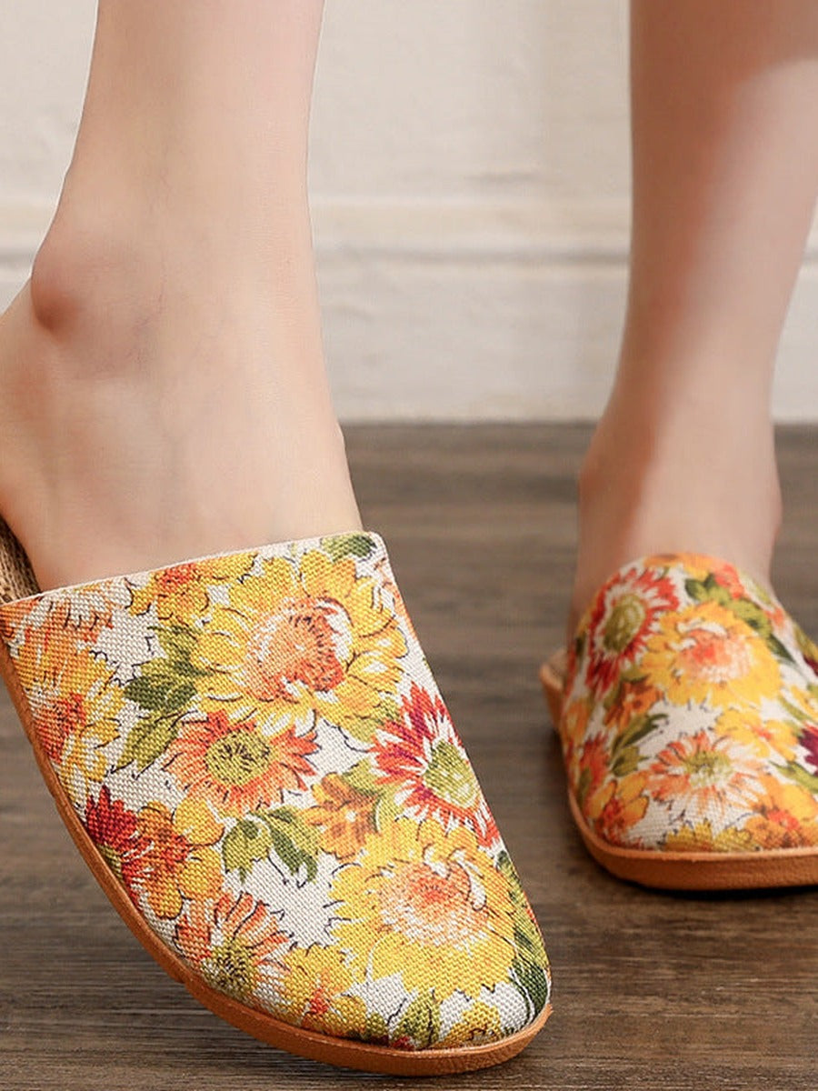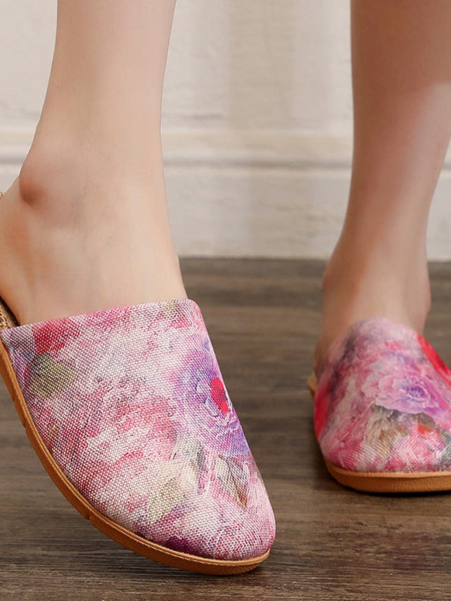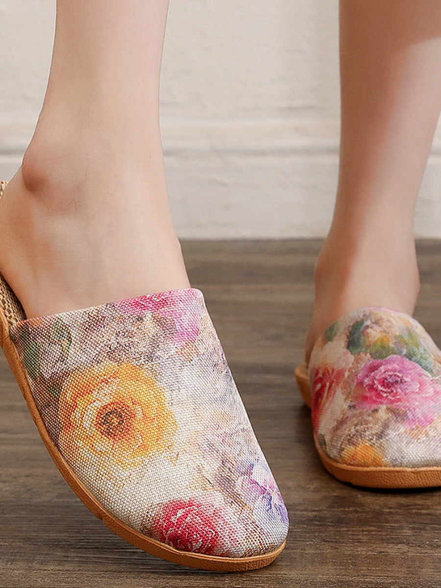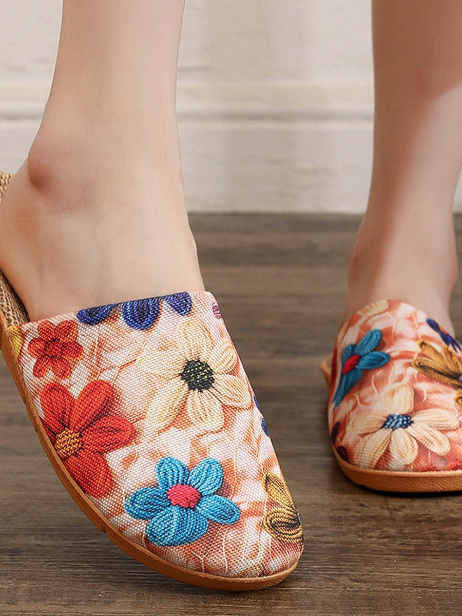Pantuflas de lino con estampado floral y puntera abierta para mujer, ideales para el verano.