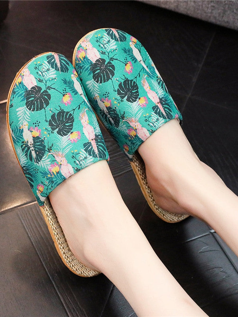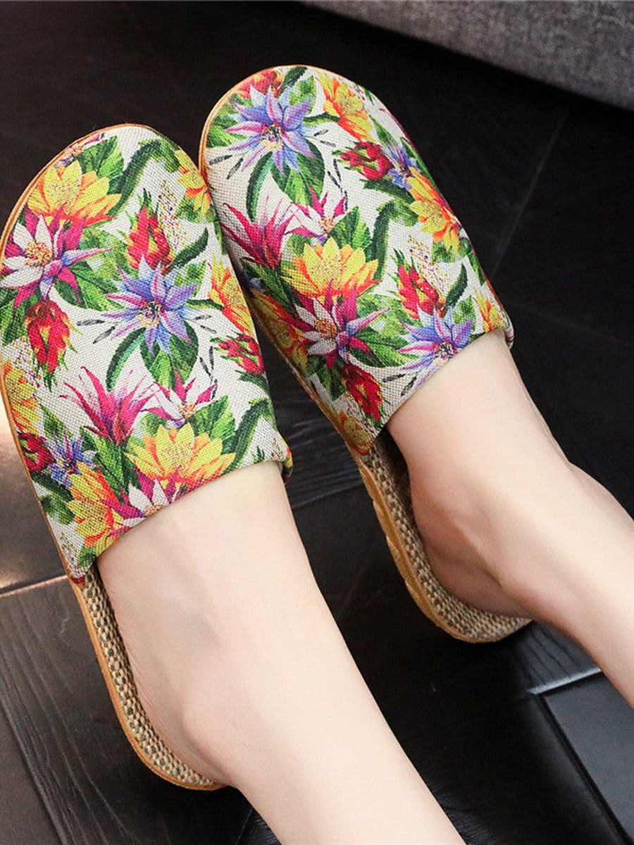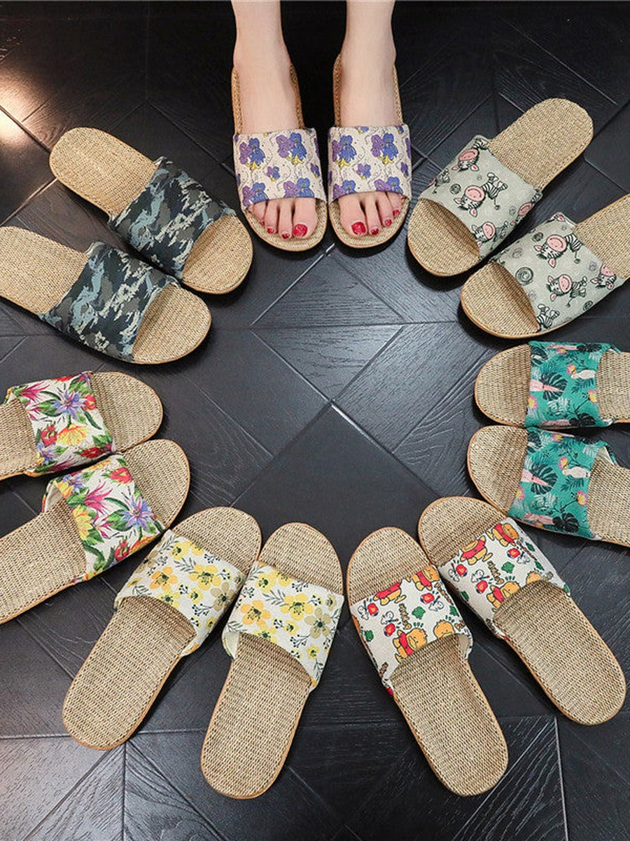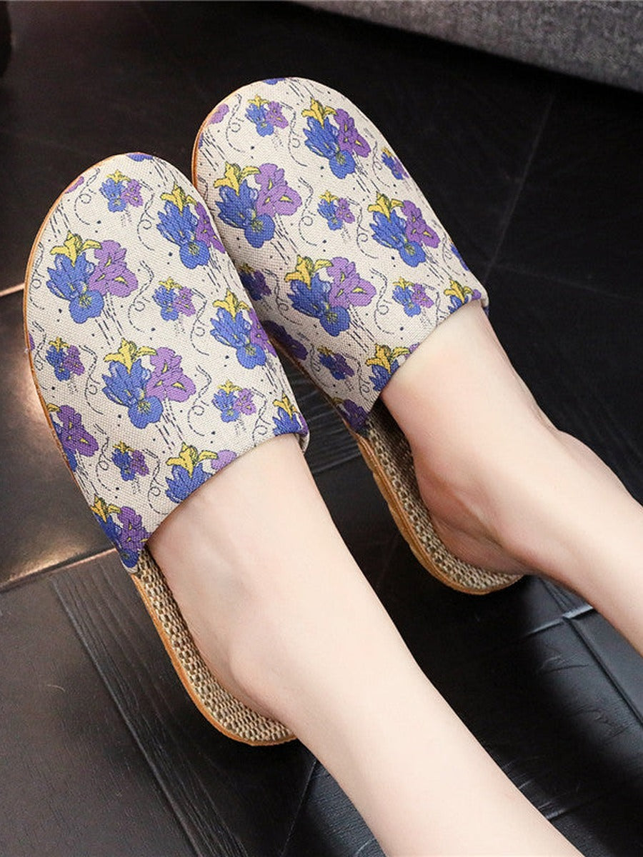 Pantuflas de mujer de lino con estampado floral y suela gruesa, ideales para el verano.