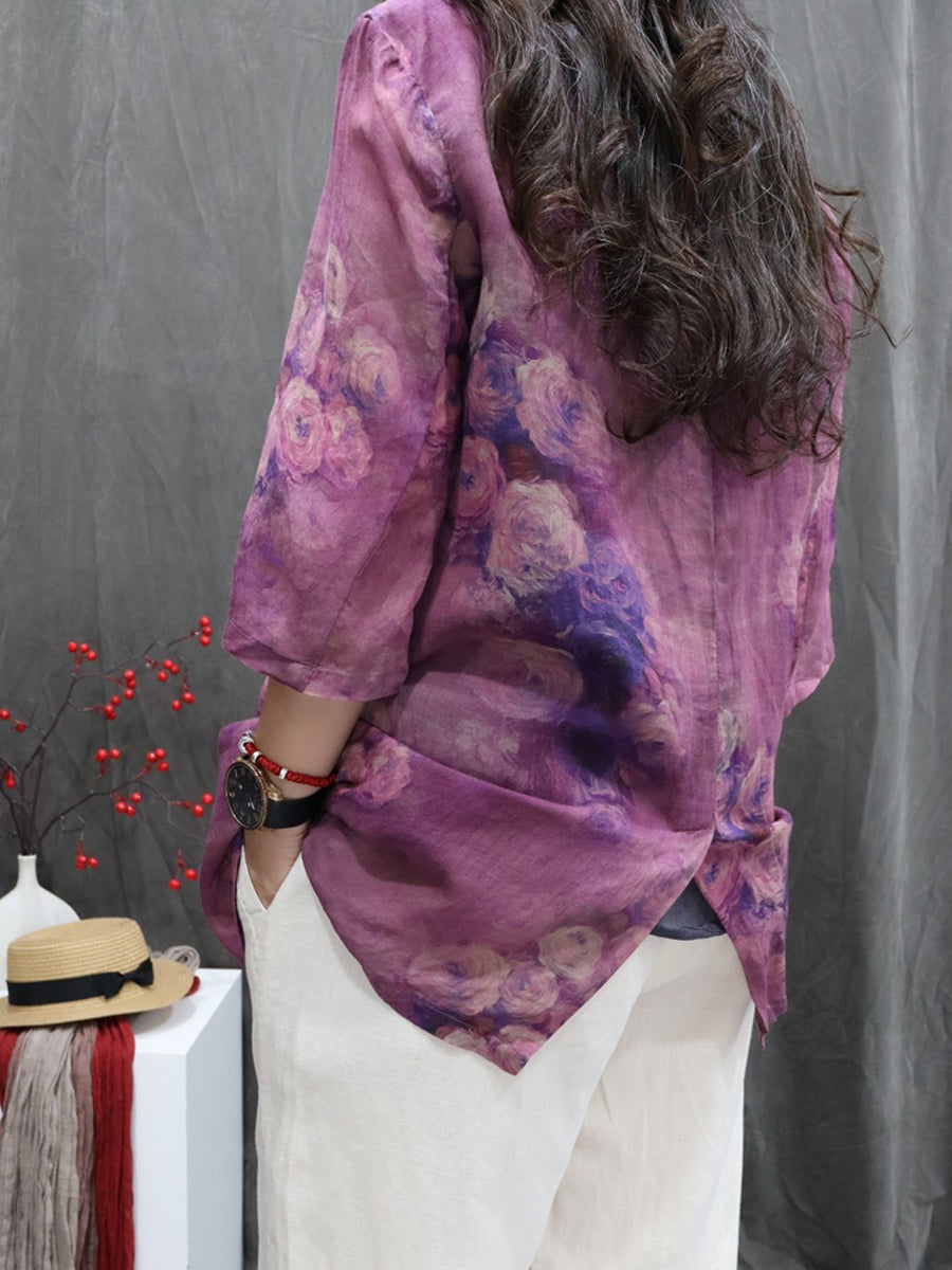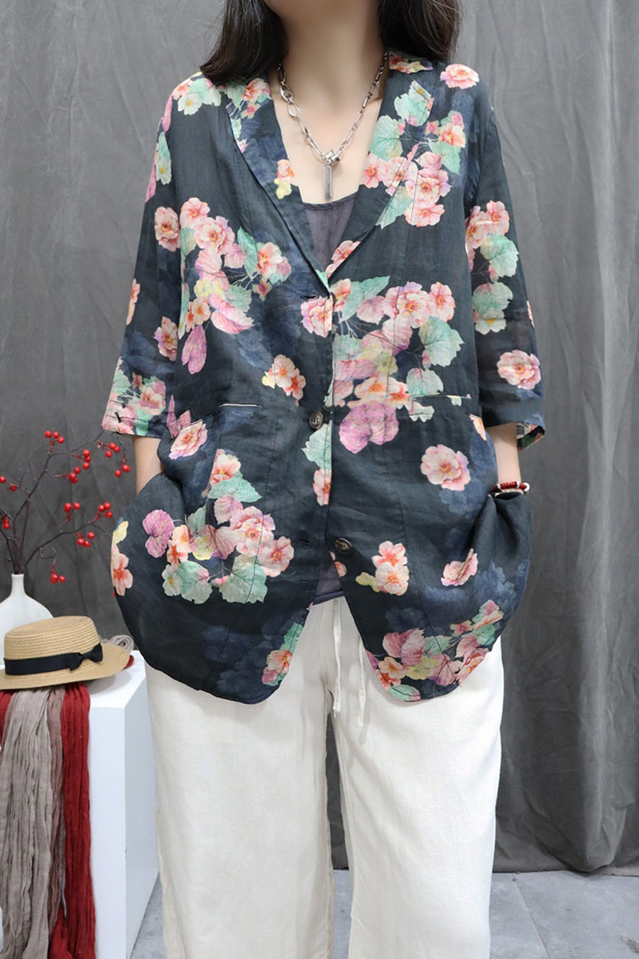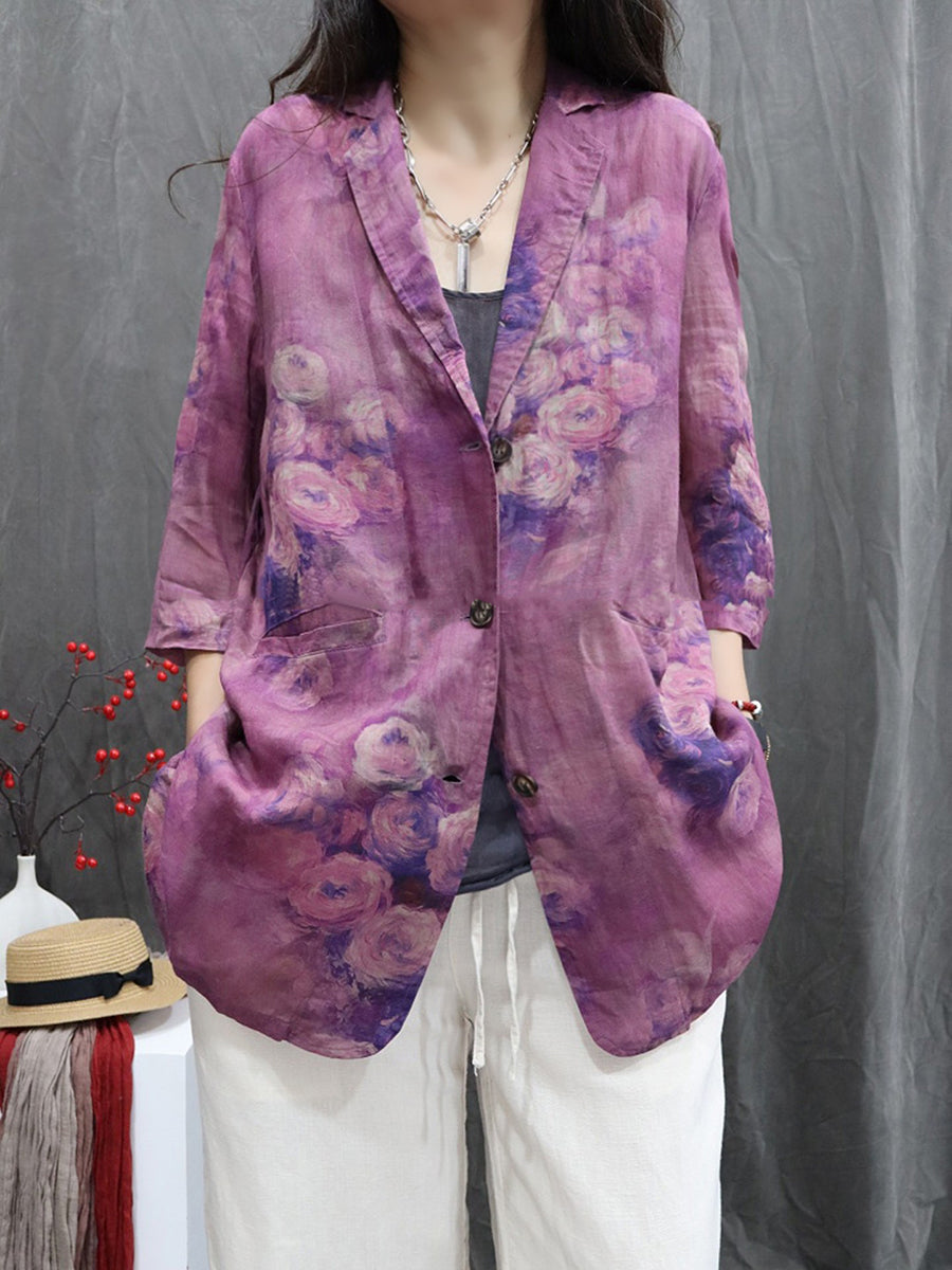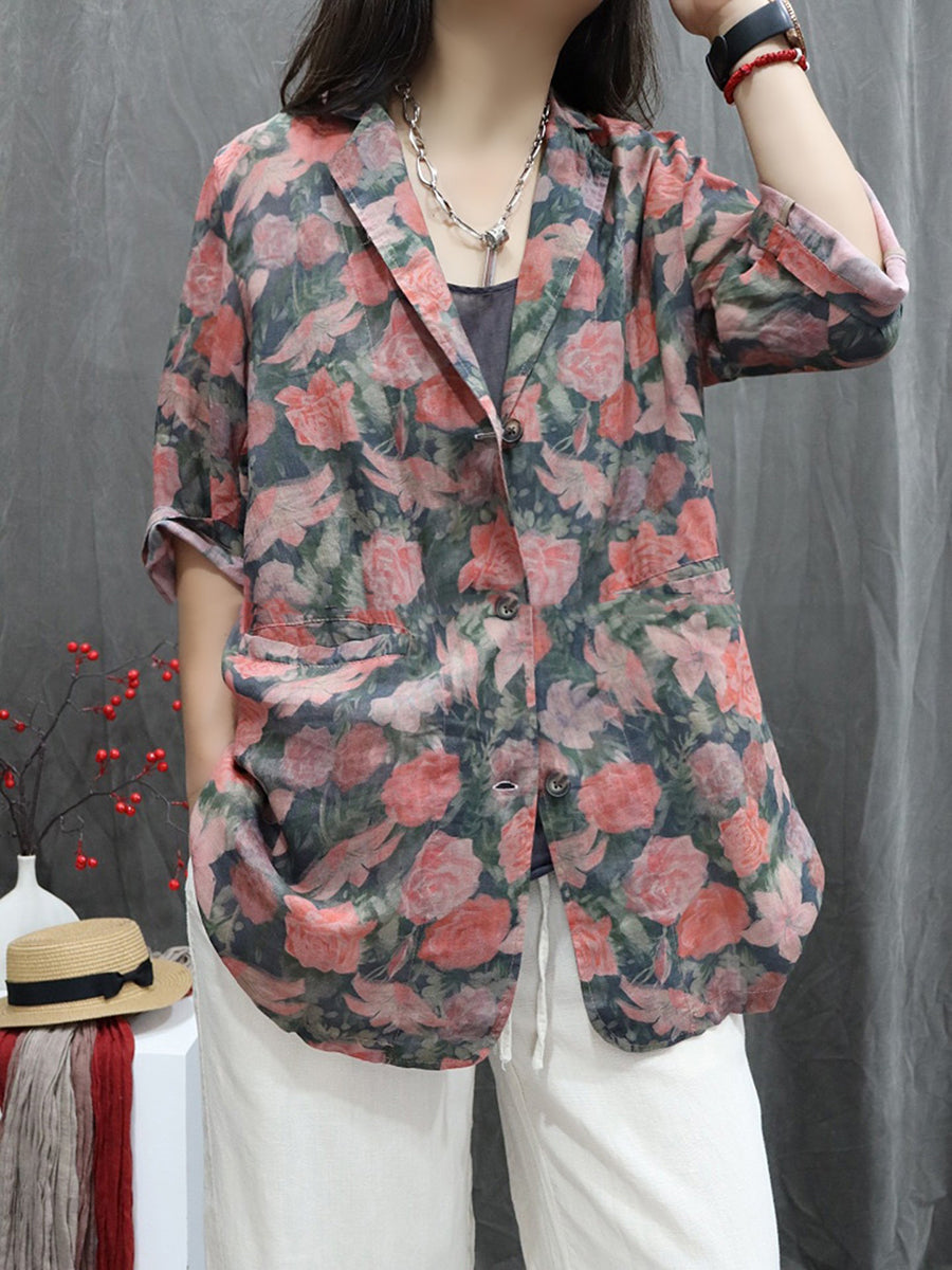 Abrigo de cuello vuelto 100 % ramio con flores de verano para mujer
