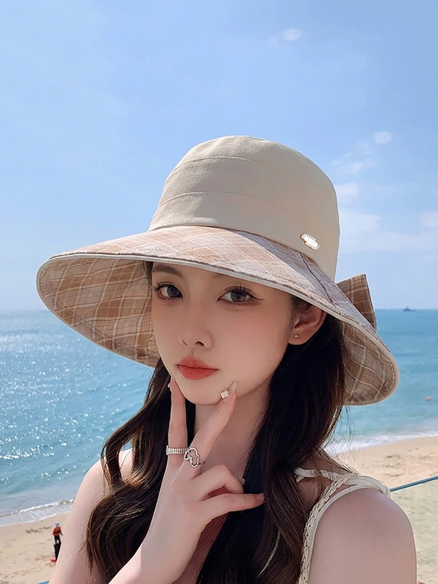 Sombrero de verano para mujer con estampado de cuadros, lazo y protección solar.