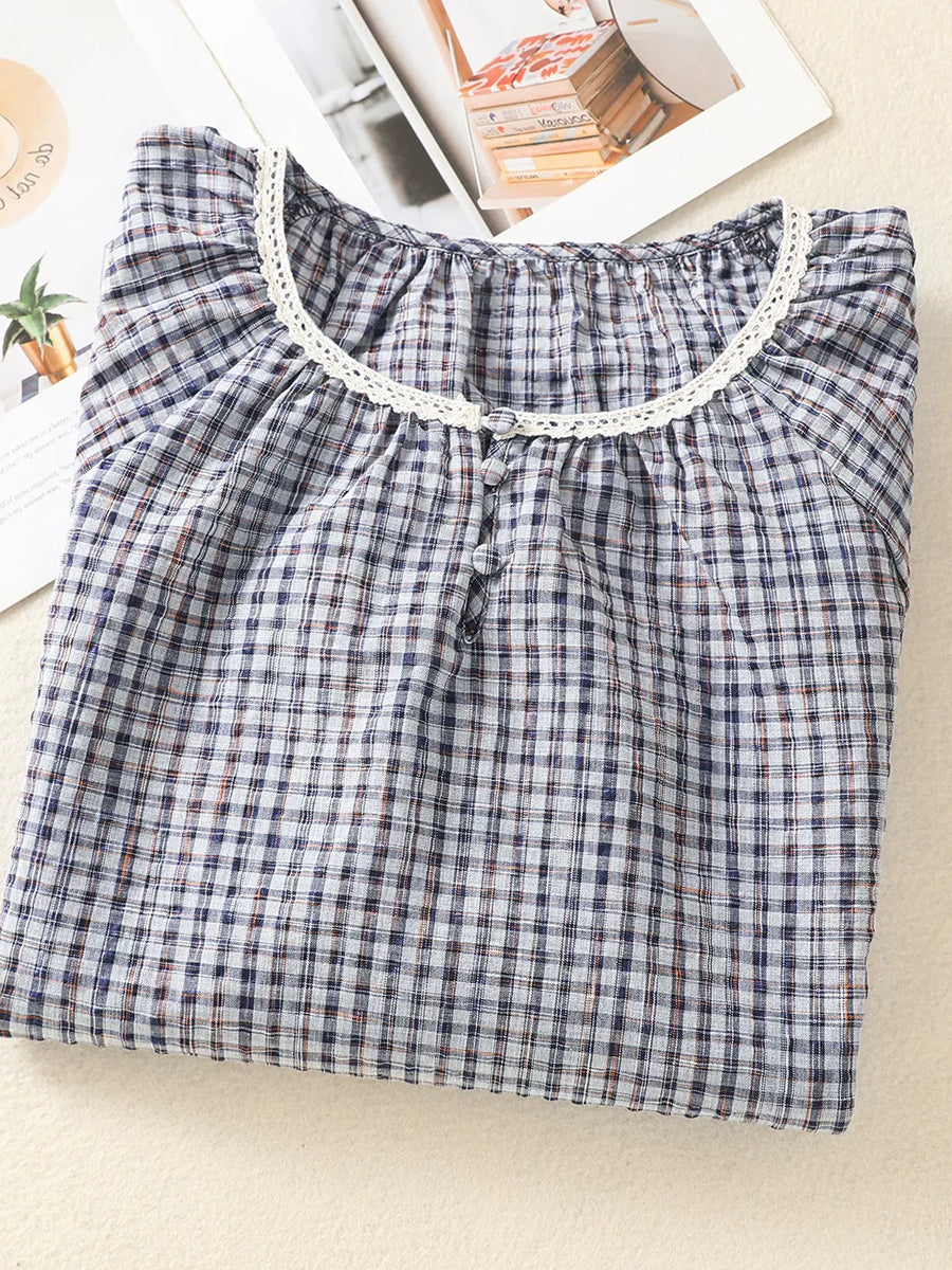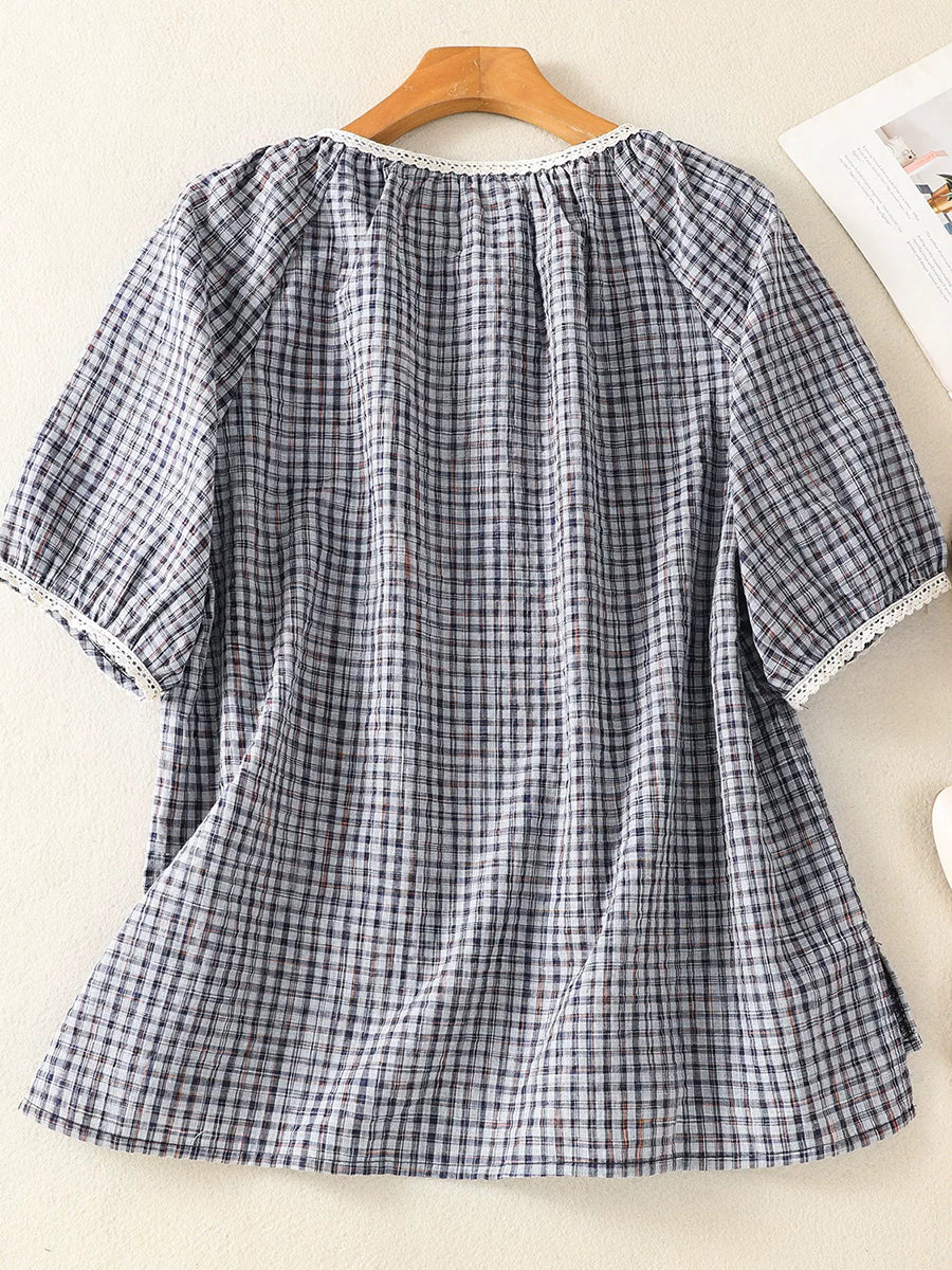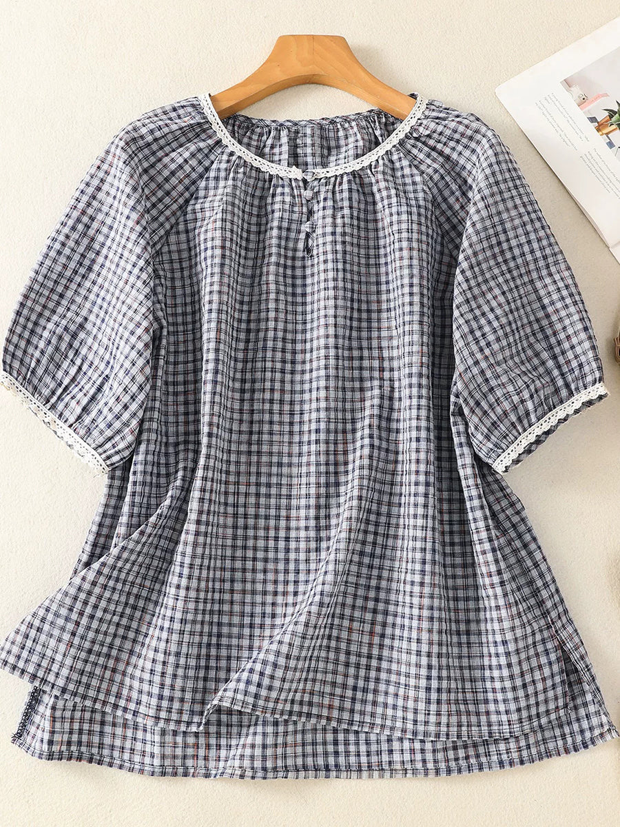 Blusa de verano retro a cuadros con cuello redondo para mujer