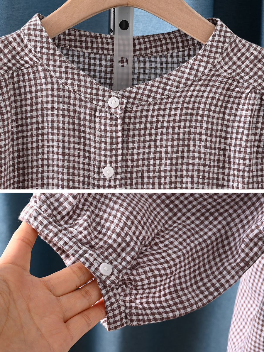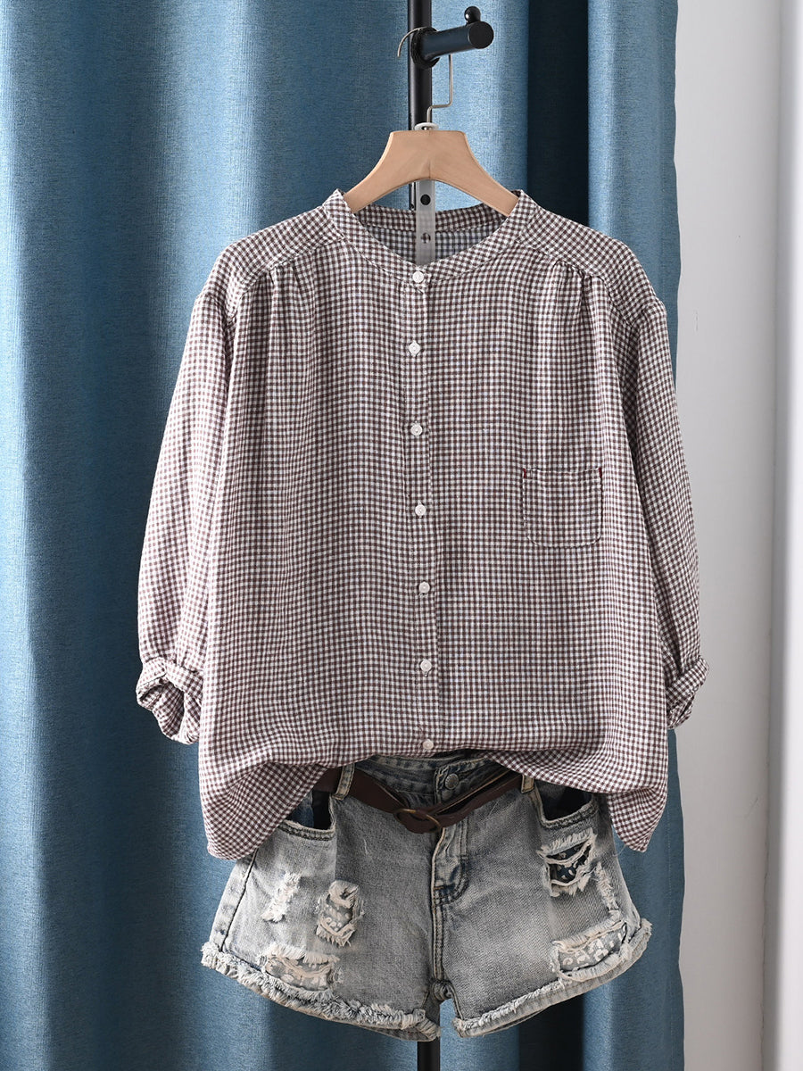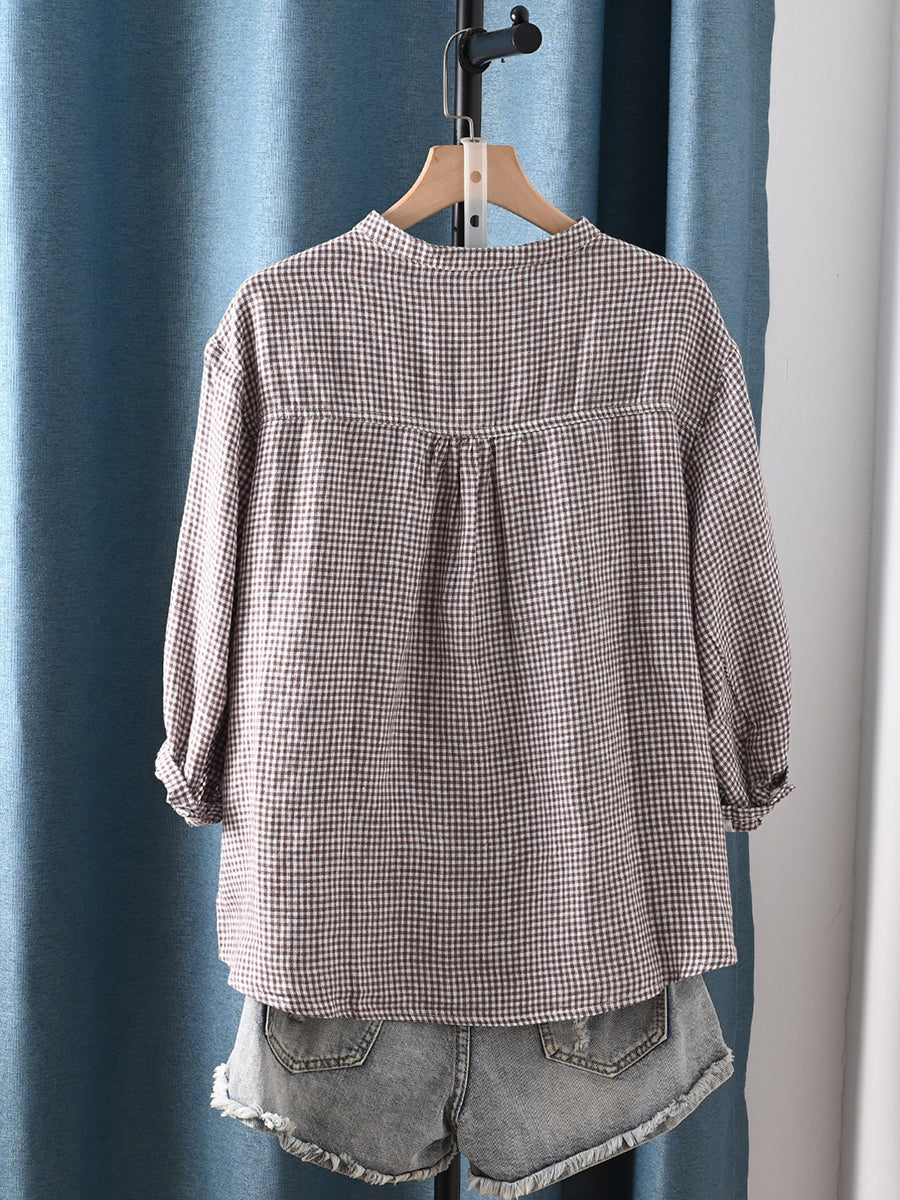 Blusa de mujer de lino 100% estilo retro a cuadros con cuello alto, ideal para el verano.