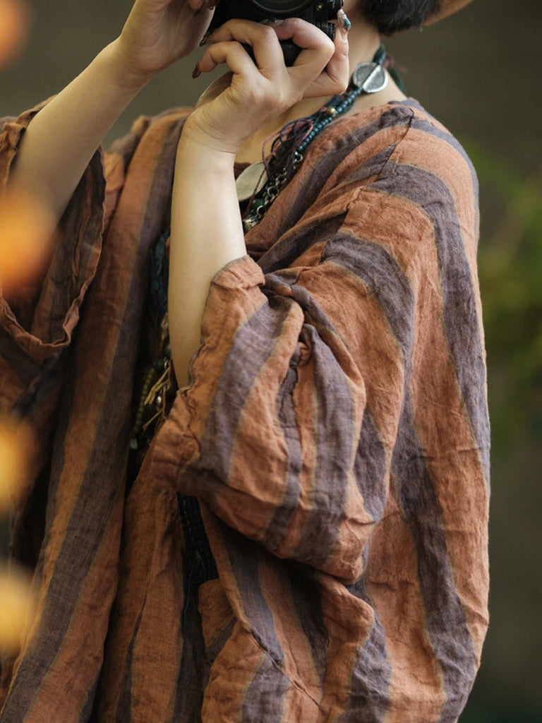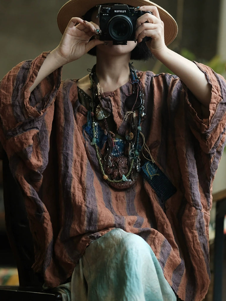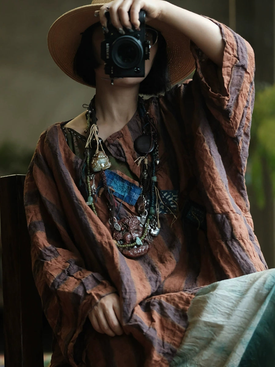 Camisa de lino con cuello redondo y parche de rayas retro de verano para mujer