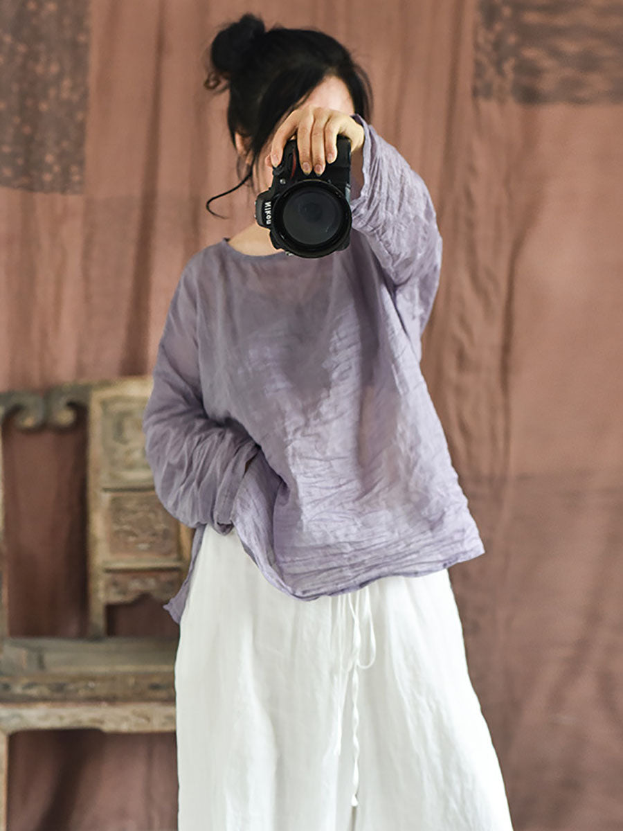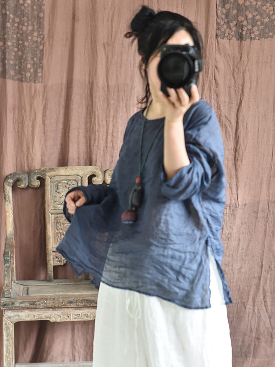 Camisa de verano para mujer, estilo vintage, lisa, con cuello redondo y dobladillo dividido, de ramio