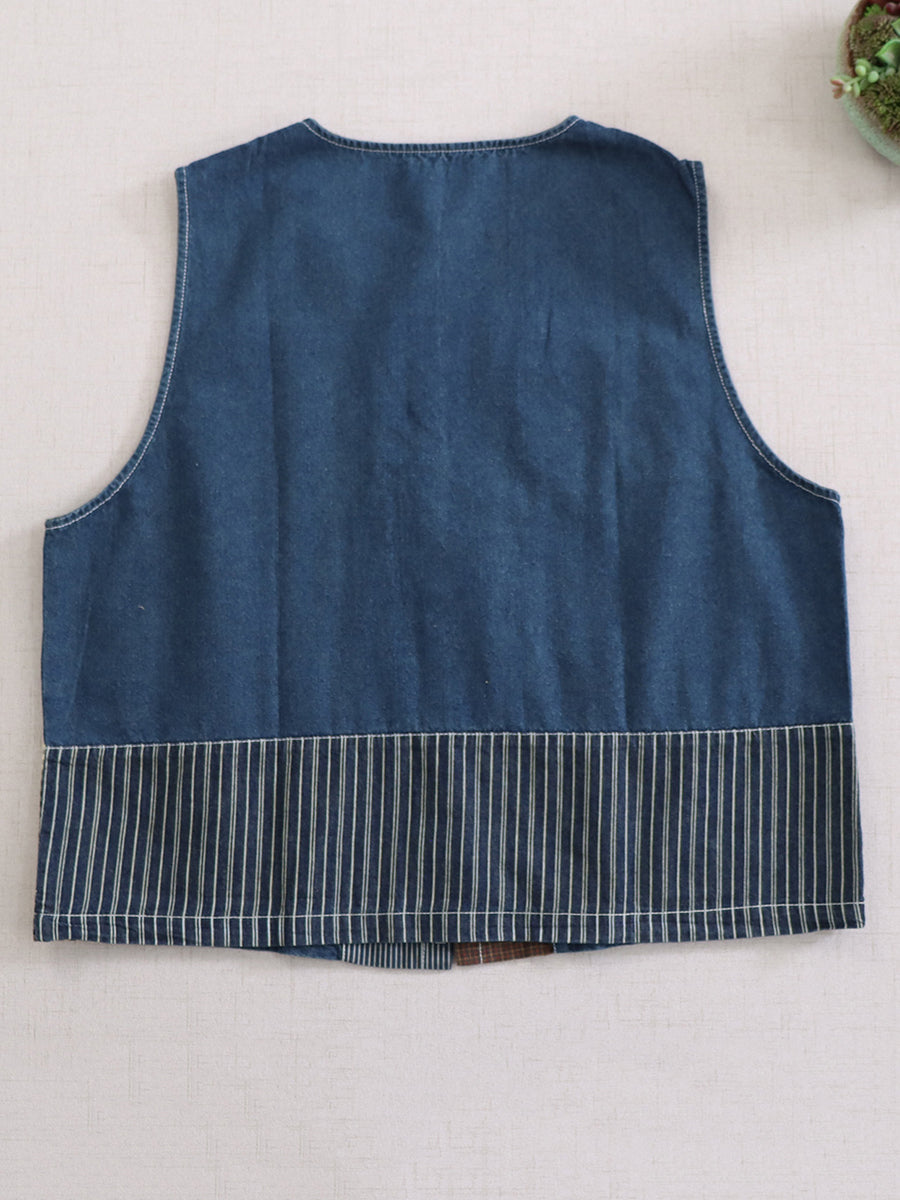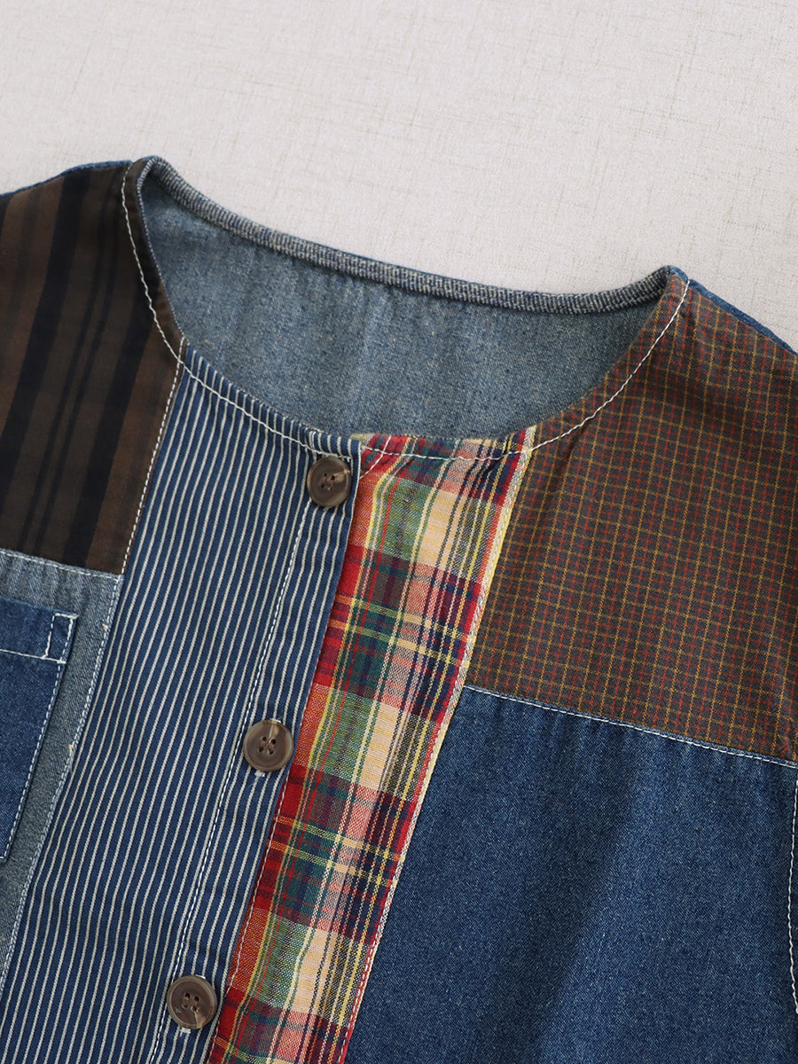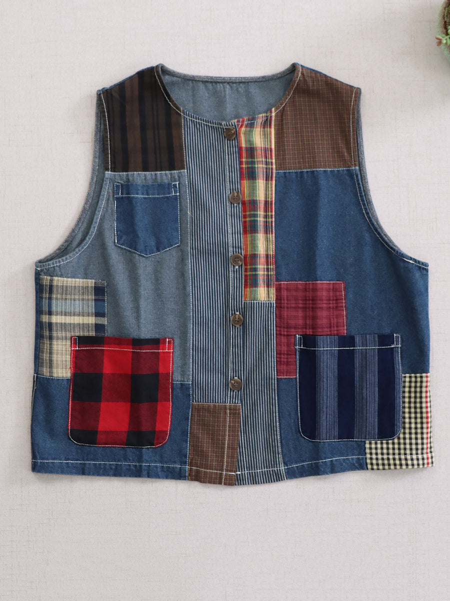 Chaleco de algodón con cuello redondo y retazos vintage de verano para mujer