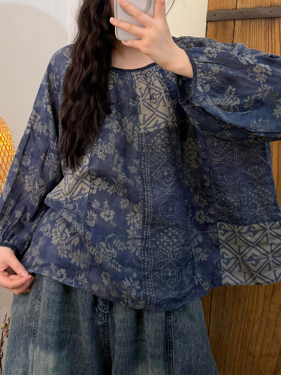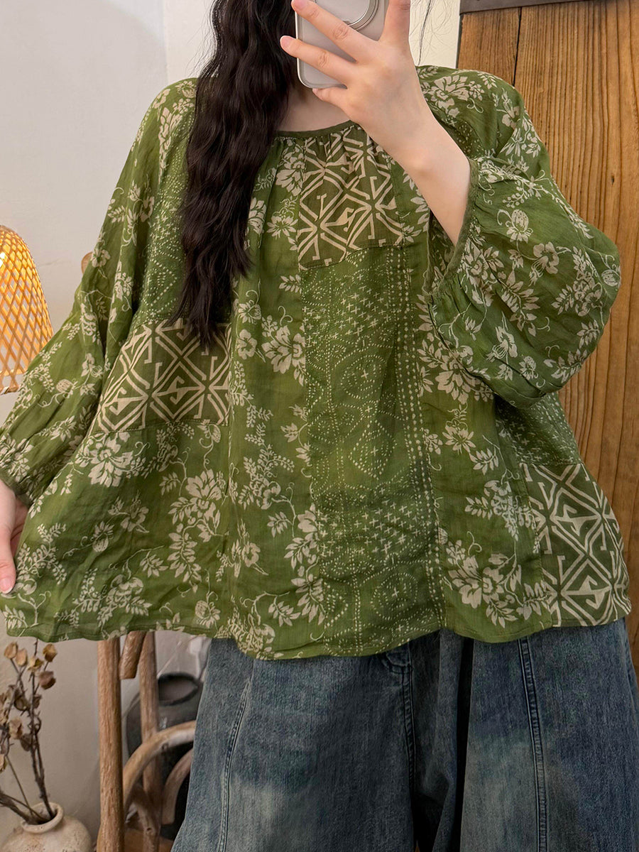 Camiseta de verano vintage de verano con cuello redondo y patchwork para mujer