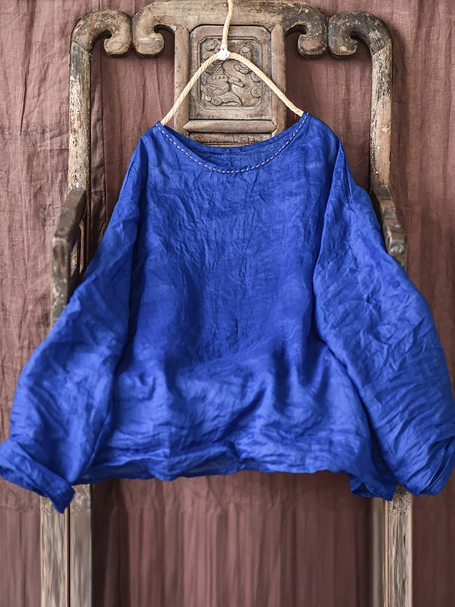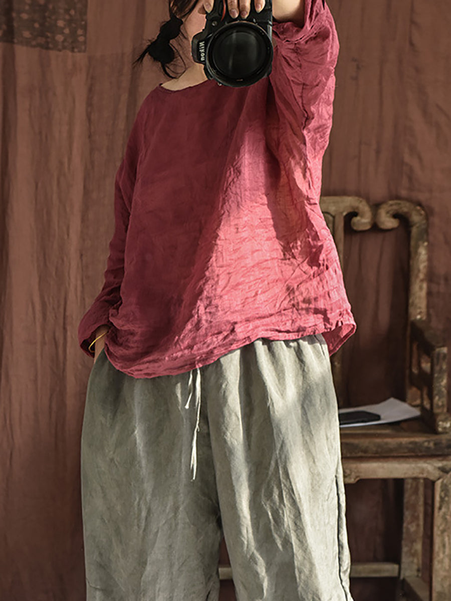 Blusa vintage de verano con cuello redondo de ramio para mujer