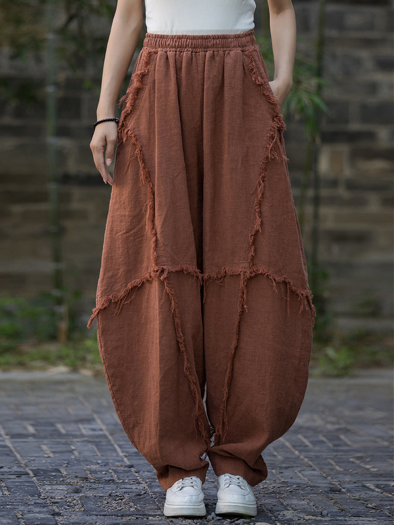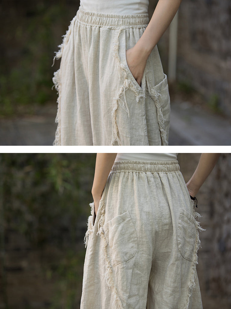 Pantalones harén de ramio con bordes sin rematar desgastados de verano para mujer