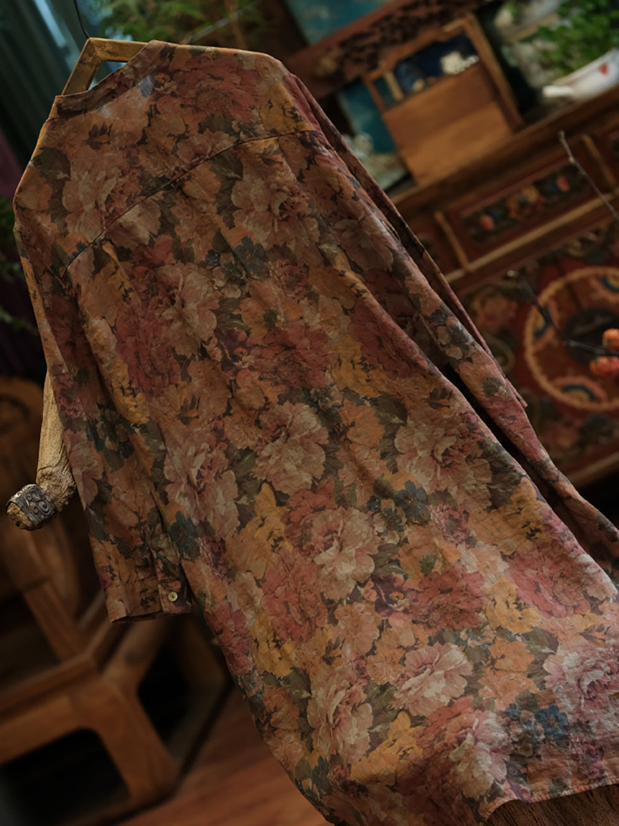 Camisa larga con botones y estampado floral retro de ramio para mujer