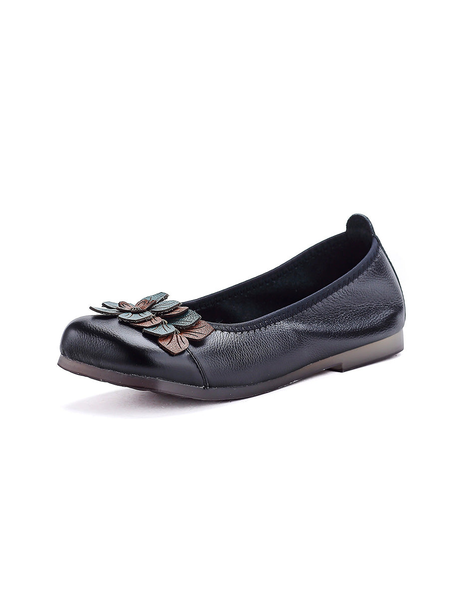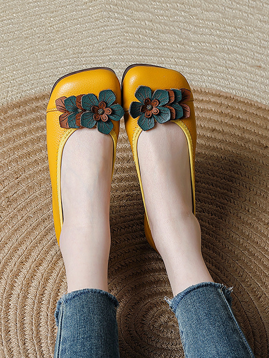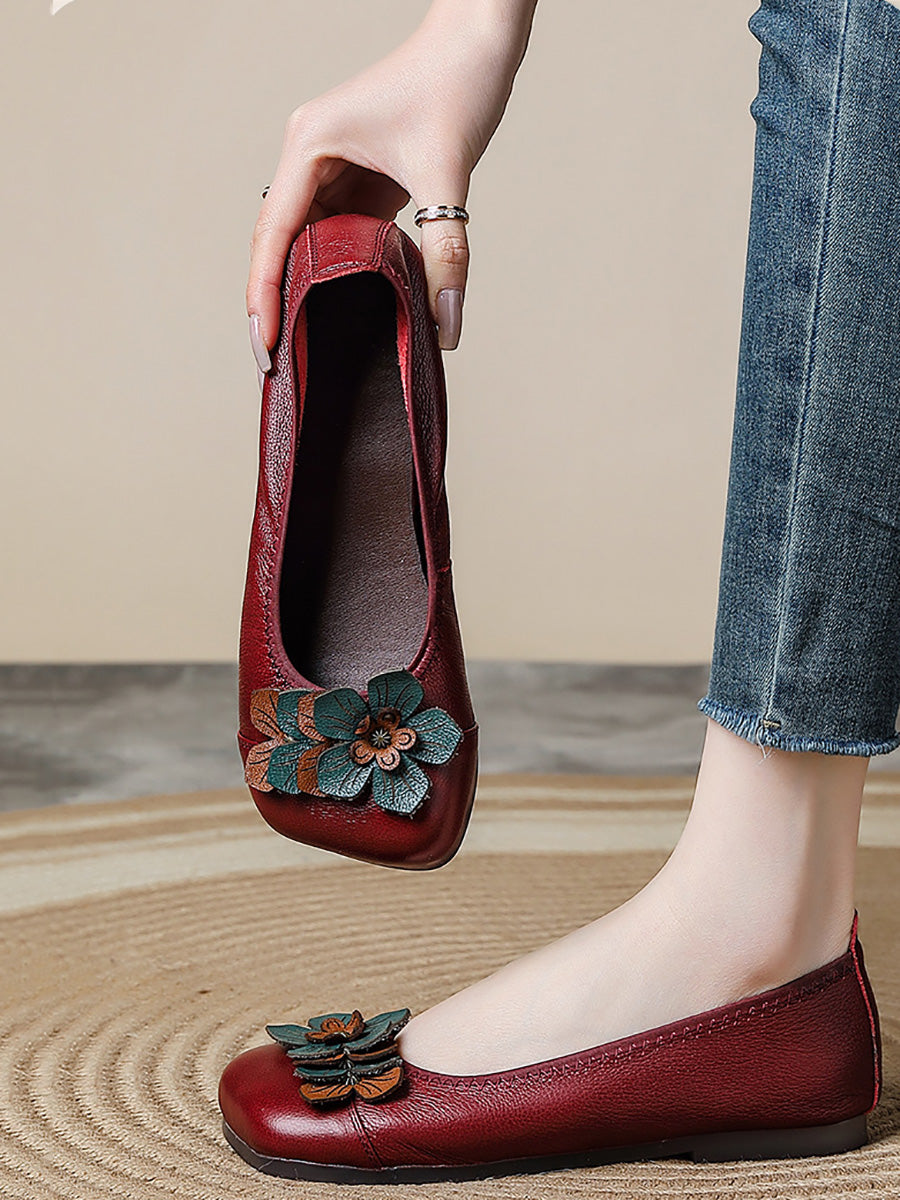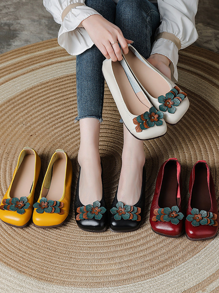 Zapatos de mujer vintage con estampado floral y detalles de cuero.
