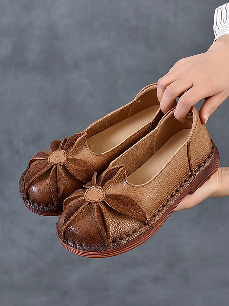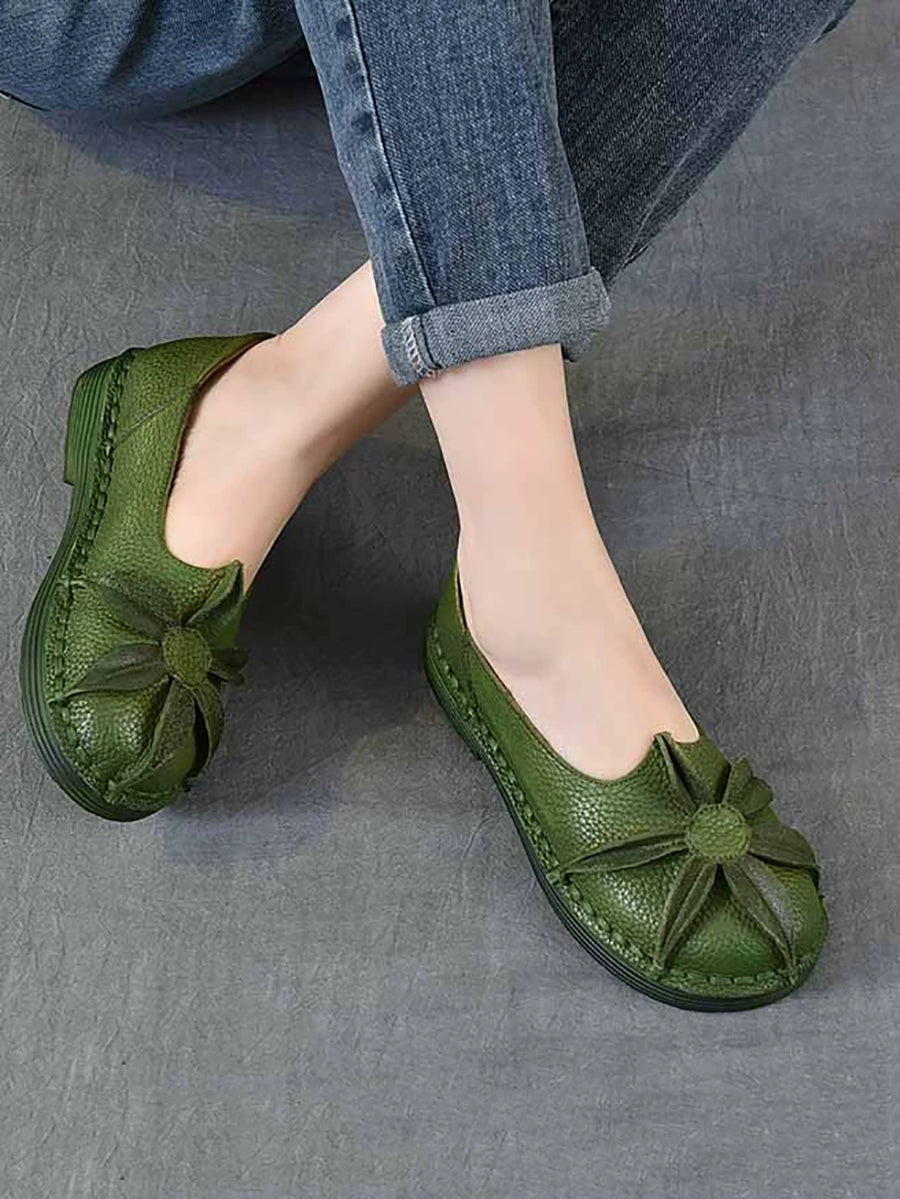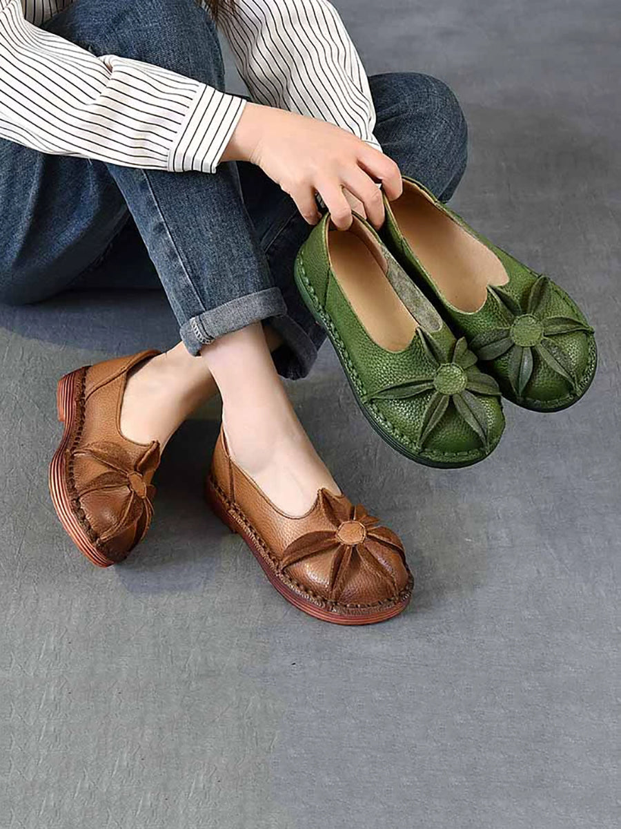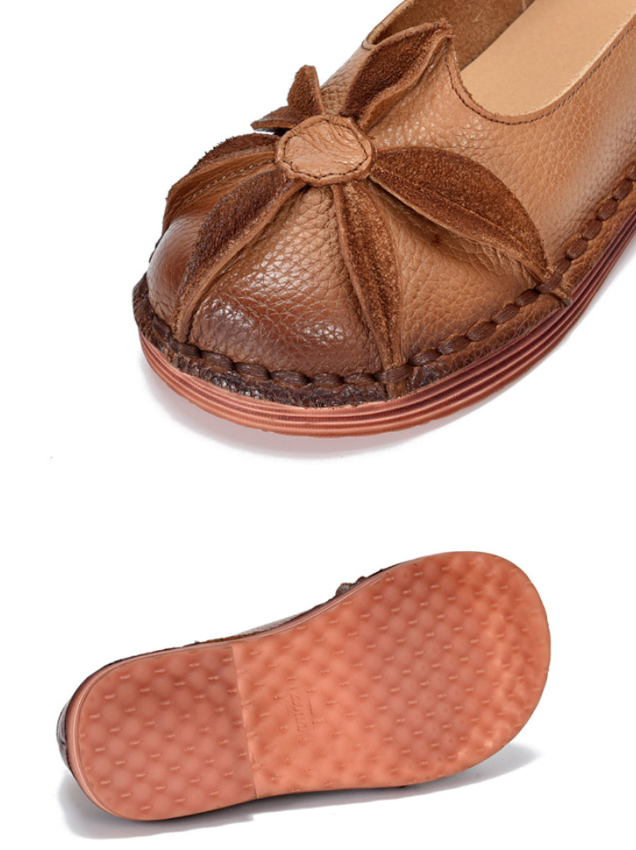 Zapatos vintage de piel auténtica con flores y tacón bajo para mujer