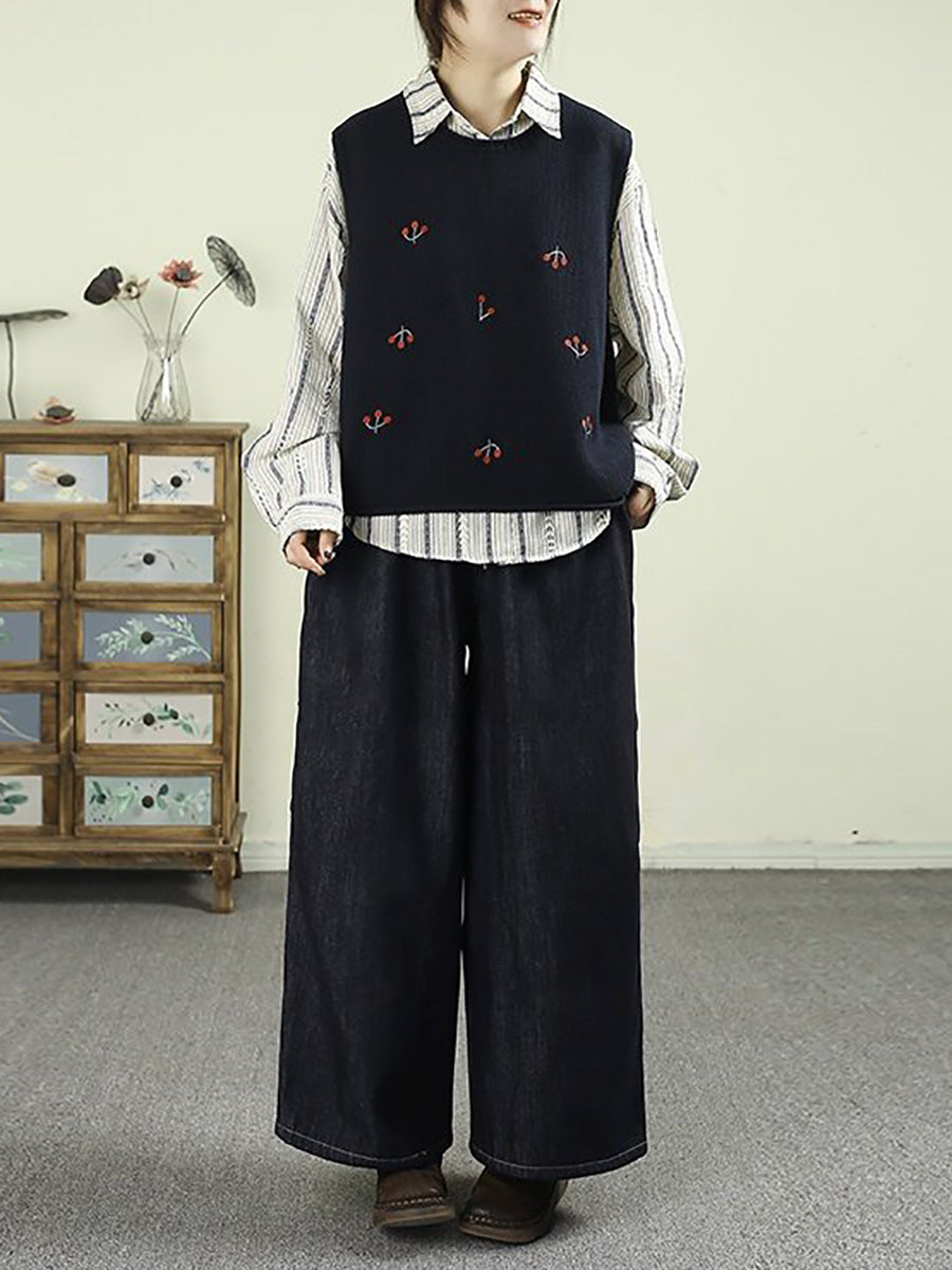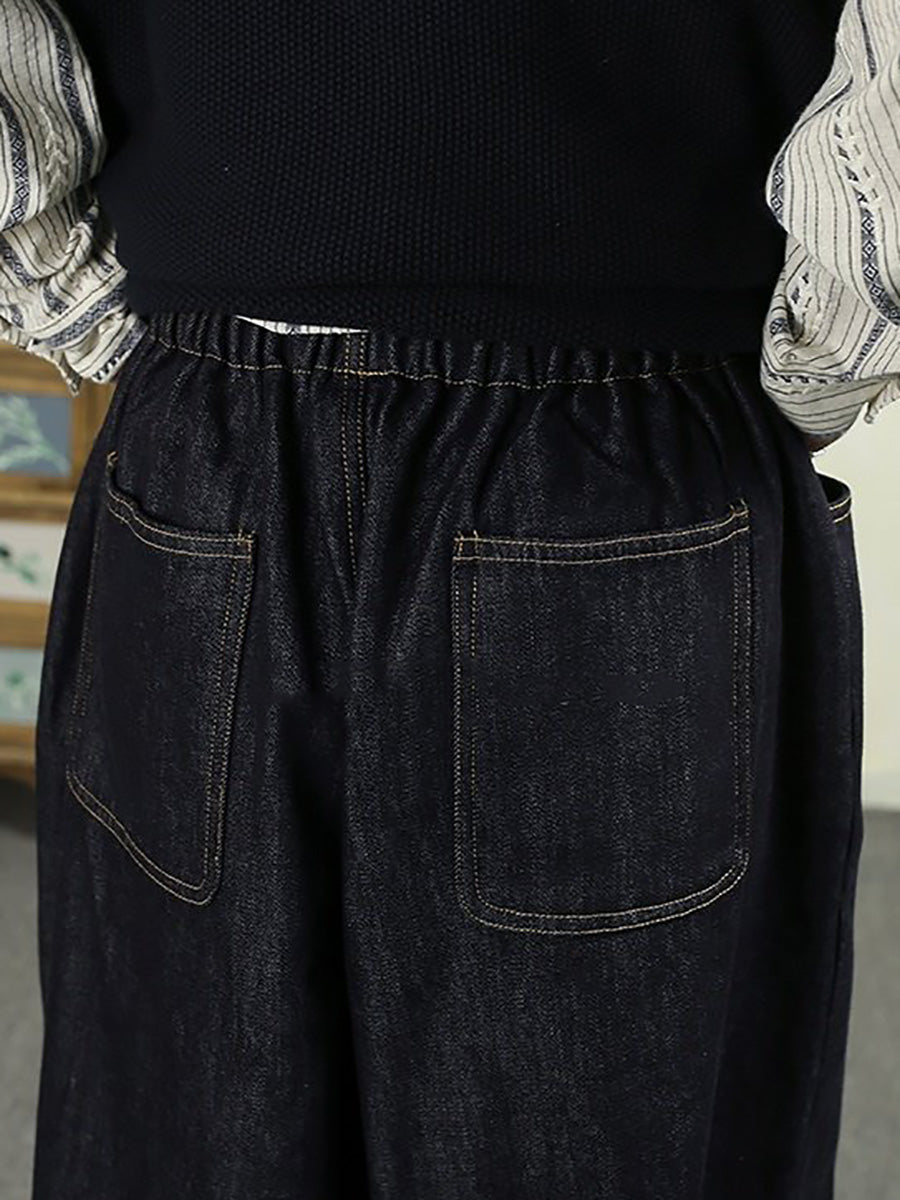 Pantalones anchos de mezclilla retro de invierno para mujer con forro polar