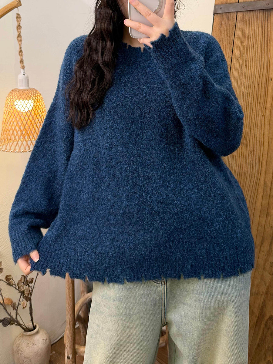 Suéter retro de invierno con cuello redondo y color puro para mujer